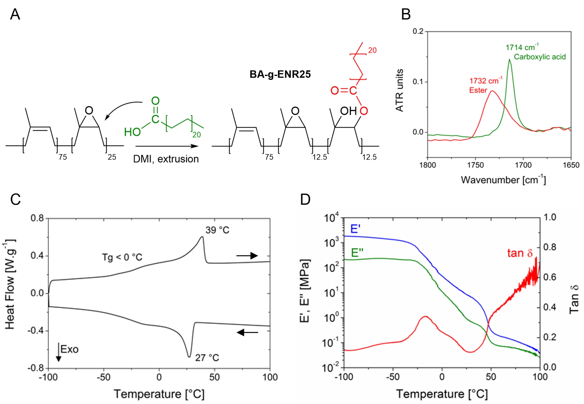 (A) Reaction scheme of ENR25 with BA at an acid-to-epoxy ratio of 1:2. (B) FTIR spectra of the ENR25/BA/DMI blend before (green) and after (red) grafting, zoomed in the carbonyl area. (C) DSC traces of BA-g-ENR25 at 10 °C⋅min−1. (D) Dynamic mechanical analysis of a BA-g-ENR25 sample at 3 °C⋅min−1.