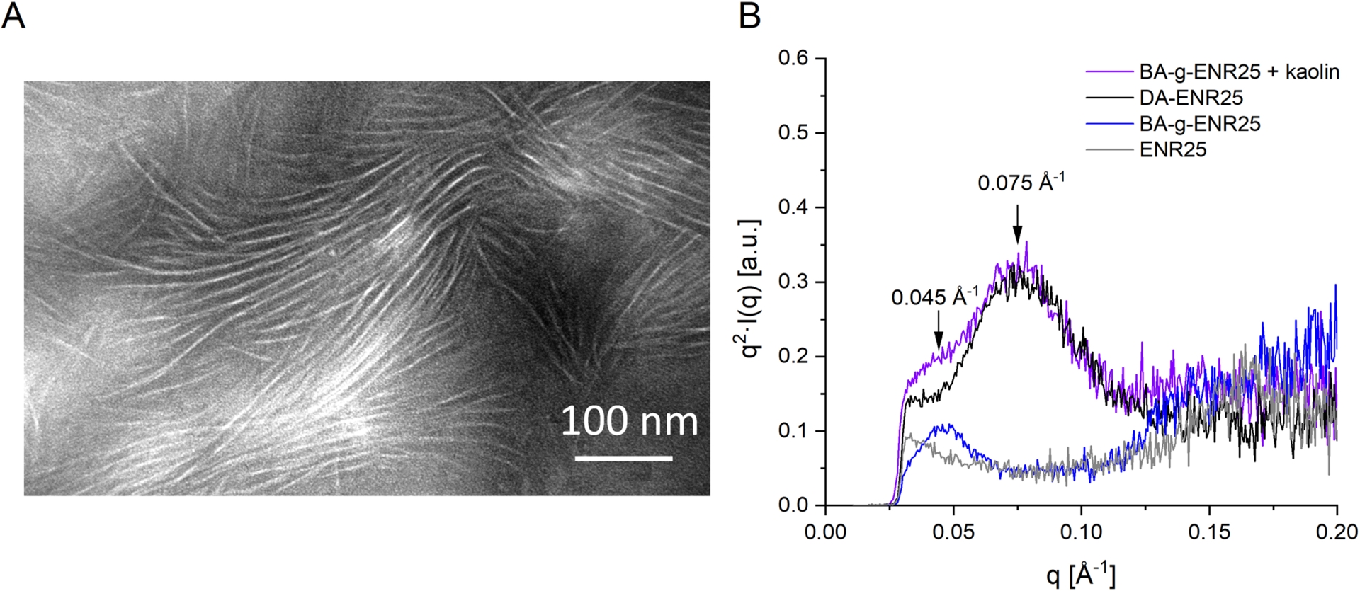 Microscopic characterization of BA-grafted ENR25, with BA constituting 37 wt% of the total formulation. (A) TEM image of the physical network stained with RuO4. Crystalline lamellae appear in white. (B) SAXS measurements comparing DA-crosslinked ENR25 (chemical network) and BA-grafted ENR25 (physical network). As the DA-ENR sample (black curve) includes kaolin used during chemical network synthesis, the BA-g-ENR sample (purple curve) was similarly loaded with kaolin for comparison.