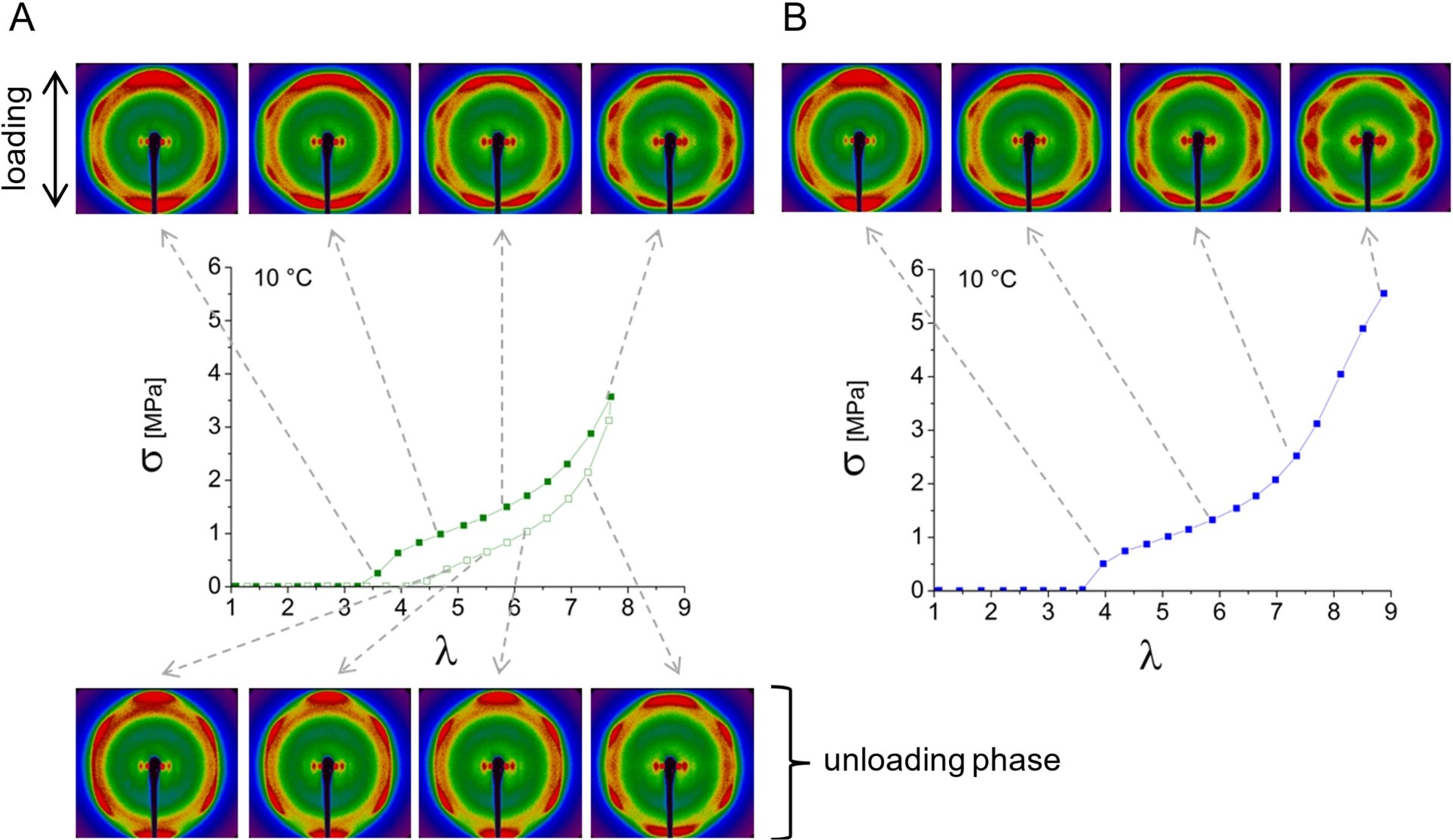 2D X-ray patterns captured at 10 °C along the stress–strain curves during (A) the second stretching cycle and (B) the third cycle, which is extended to rupture. Filled and empty squares represent loading and unloading, respectively, with a strain rate of 1.25 min−1.