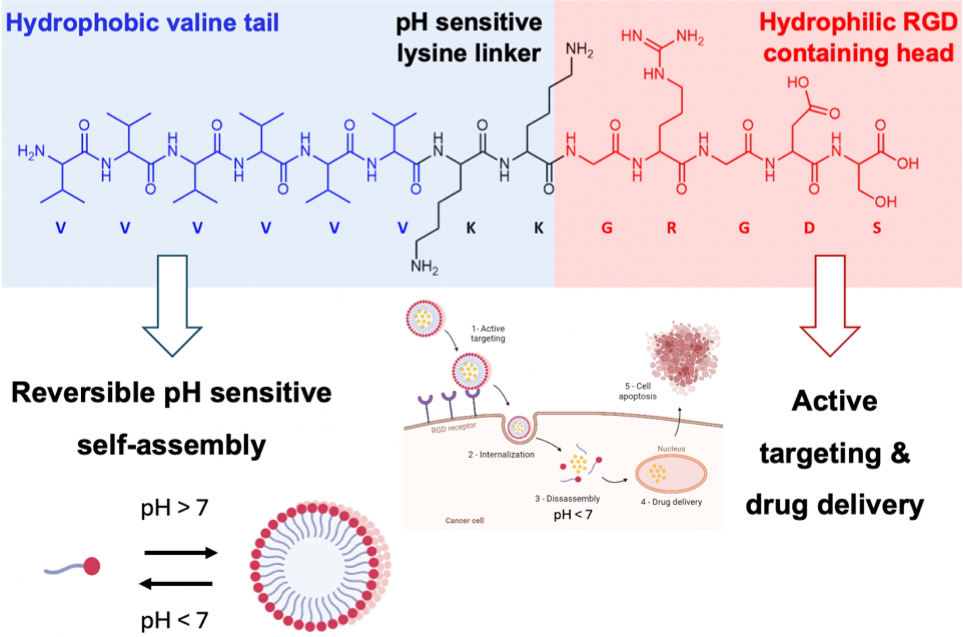 Amphiphilic peptide sequence VVVVVVKKGRGDS (P1), presenting a reversible pH-sensitive self-assembly and properties for the targeted release of anti-cancer molecules into tumor cells. Adapted from Ref. [18].