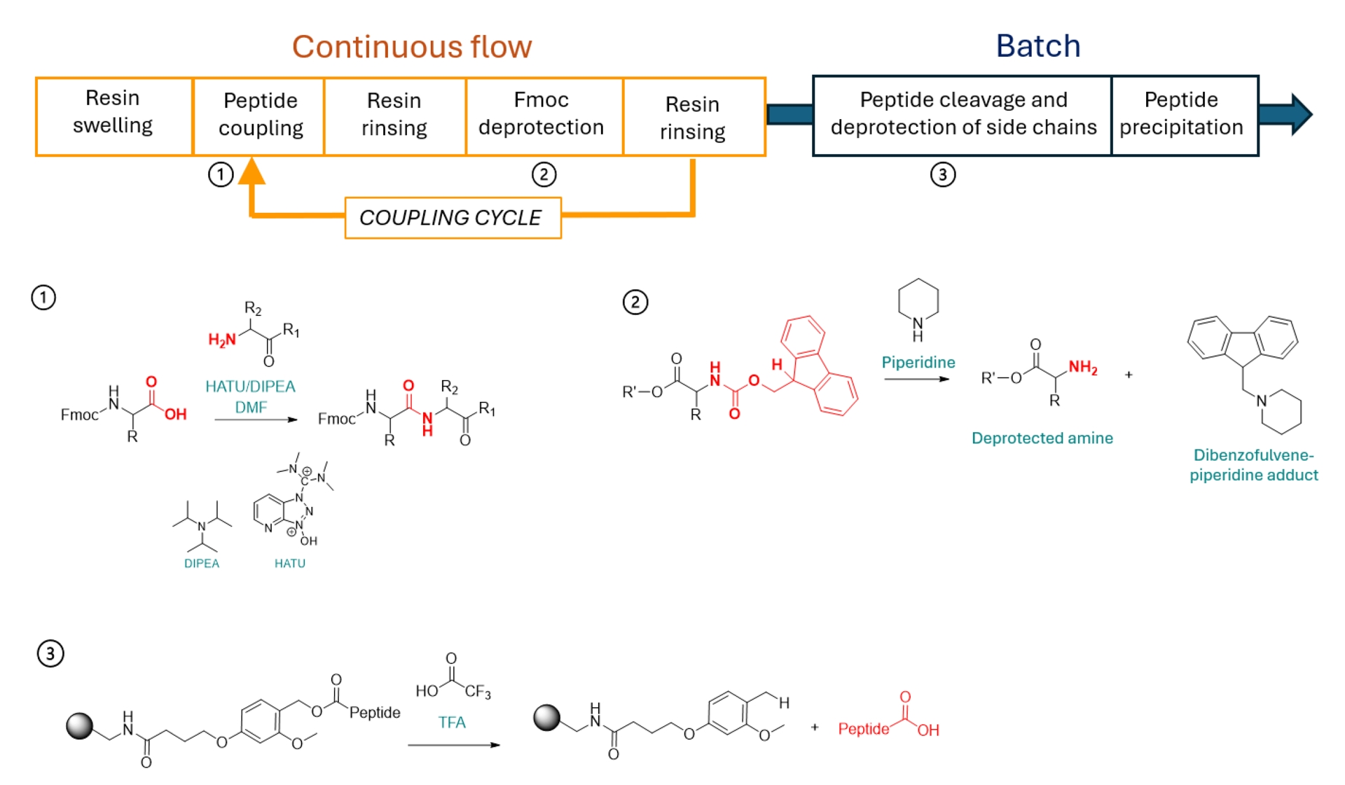 Chemical reactions involved in peptide synthesis and workflow.