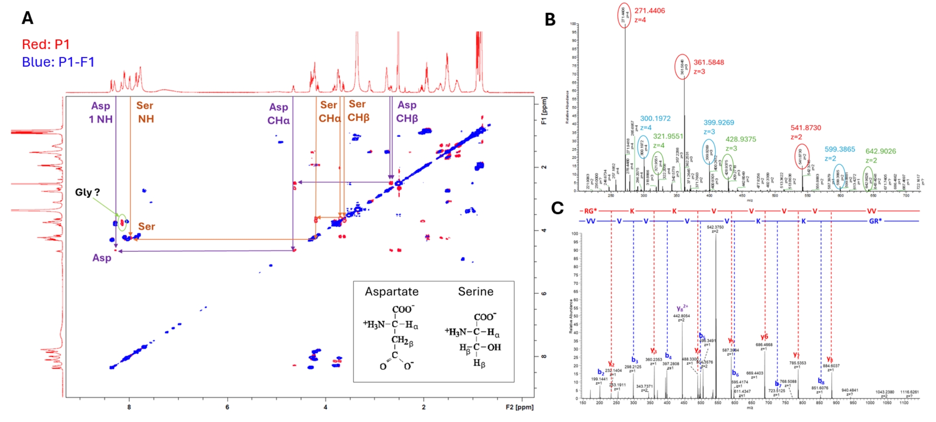 (A) 2D COSY NMR spectrum of P1–F1 (blue) overlaid with a reference P1 peptide (red). (B) ESI-HRMS and (C) MS/MS spectra of P1–F1.