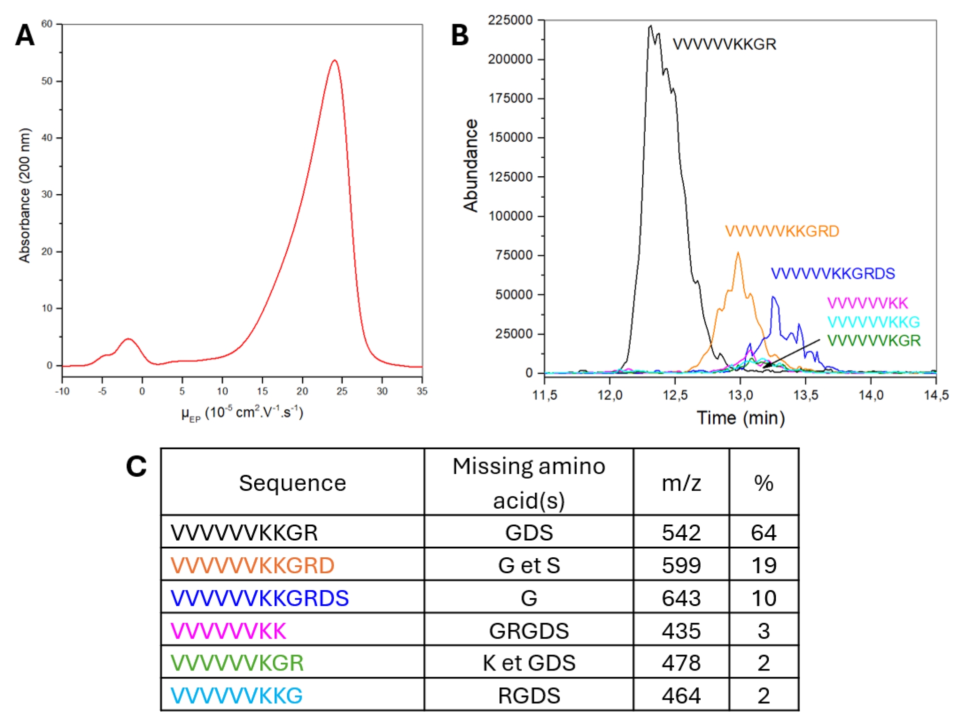 (A) CE-UV electropherogram of P1–F1 in 20 mM ammonium formate BGE (pH 3.7). (B) Extracted-ion signals from the total ion CE-ESI-MS electropherogram at specific m/z values summarized in (C). (C) Identification of the different sequences in P1–F1, with their corresponding missing amino acids and their relative abundance in the sample.