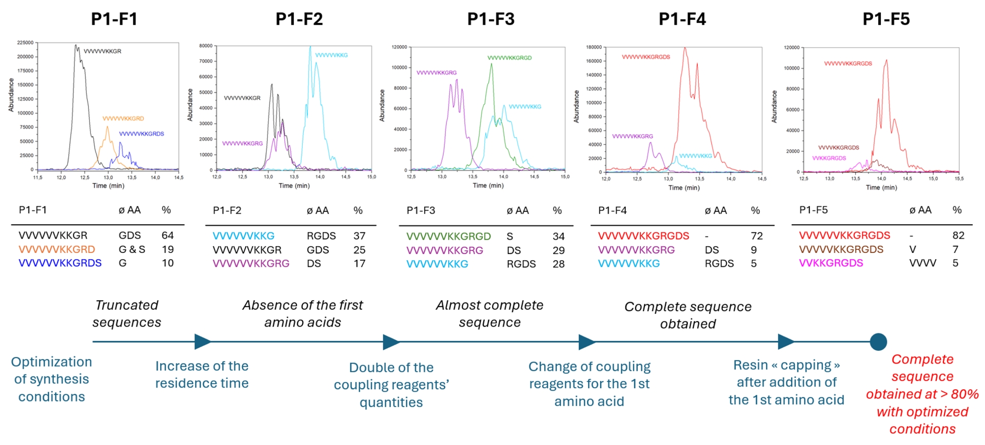 Again, CE-ESI-MS analysis of the products generated by this new protocol showed an increase of the purity of the expected peptide sequence up to 82%. This time, residual remaining truncated sequences were mostly related to missing amino acids in the end of the sequence, due to a non-quantitative peptide bond formation with the hydrophobic valines. This result validates the interest of adding a capping step to the protocol.