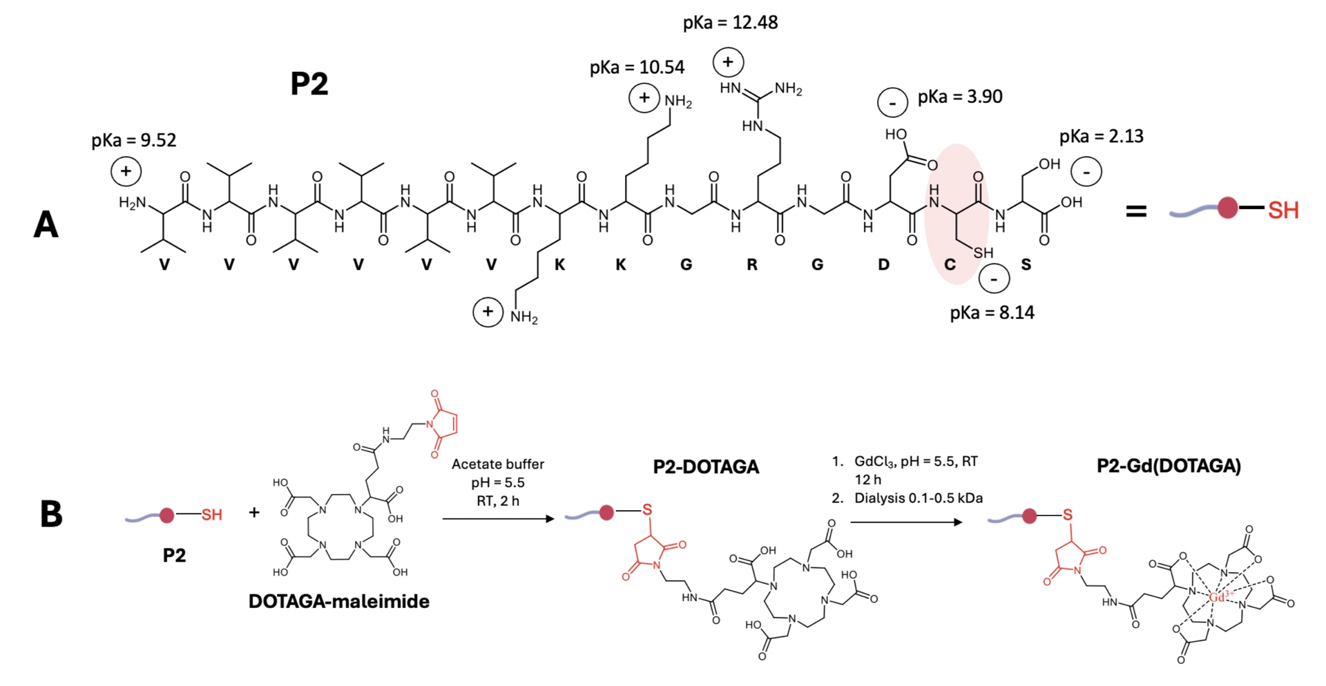(A) Molecular structure of P2 peptide, with pKa values of ionizable functions. (B) General scheme of the functionalization of P2 with DOTAGA via thiol/maleimide reaction, followed by Gd complexation, in 20 mM acetate buffer (pH 5.5). Adapted from Ref. [47].