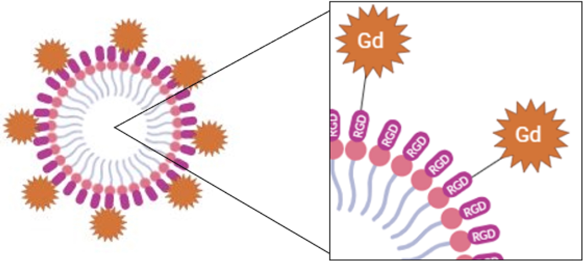 Our strategy consisted of functionalizing the peptide sequence with a gadolinium complex, as Gd-Based Contrast Agents (GBCA) are the most used Contrast Agents (CA) in clinical MRI [42], and then formulating the self-assembly of the Gd complex functionalized peptide. Therefore, few strategic points had to be considered: the functionalization should be performed to preserve the pH-sensitive self-assembling properties, the active targeting by the RGD sequence, and the positioning of the MRI probe in the vicinity of the nanoobject surface, for an efficient MRI response.