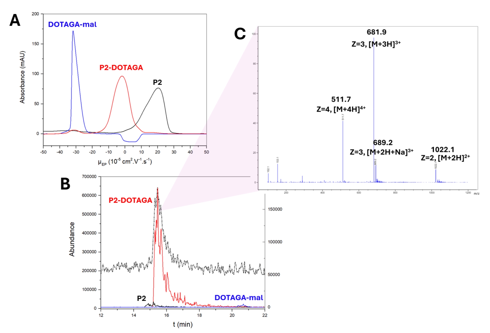 (A) CE-UV electropherograms of DOTAGA-maleimide (DOTAGA-mal) (blue), P2 (black) and the crude functionalization product (red), in 20 mM ammonium formate buffer (pH 5.5). (B) CE-ESI-MS electropherogram of the reaction product. Total ion signal (m/z 100–1200, black line) and extracted ion signals specific of P2-DOTAGA (red), of P2 (black) and of DOTAGA-maleimide (blue). (C) Extracted mass spectrum from the total ion electropherogram (black line in (B)) of the reaction product under the peak at 15.5 min. Adapted from Ref. [47].