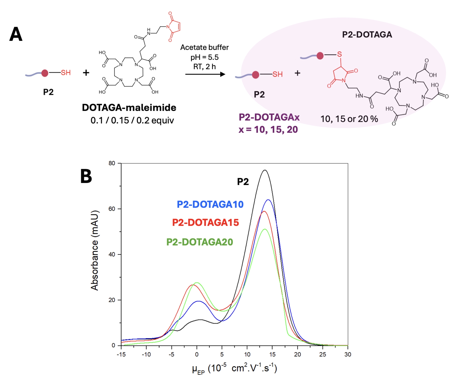 (A) Reaction scheme of the functionalization of P2 with different amounts (0.1, 0.15 and 0.2 equiv) of DOTAGA-maleimide in 20 mM acetate buffer (pH 5.5), to form mixtures of P2 and 10, 15 and 20% of P2-DOTAGA, called P2-DOTAGA10, P2-DOTAGA15 and P2-DOTAGA20, respectively. (B) CE-UV electropherograms of P2 and mixtures P2-DOTAGA10, P2-DOTAGA15 and P2-DOTAGA20 in 20 mM acetate buffer (pH = 5.5). Adapted from Ref. [47].