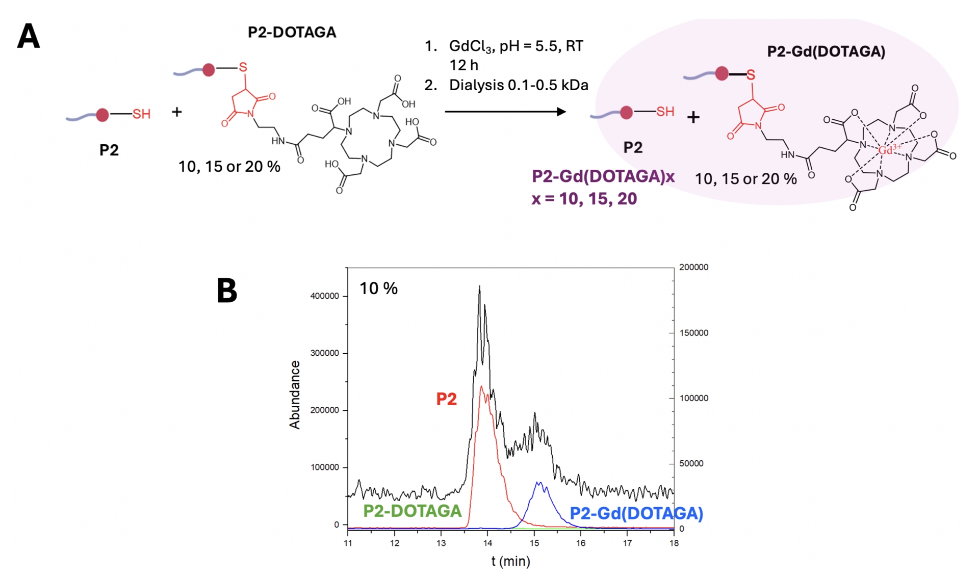 (A) Reaction scheme of the complexation of Gd by P2-DOTAGA, to form mixtures of P2 and 10, 15 and 20% of P2-Gd(DOTAGA) in 20 mM acetate buffer (pH 5.5). (B) CE-ESI-MS electropherogram of mixture P2-Gd(DOTAGA)10, with the total ion signal (black, m/z 400–1150) and single ion signals at m/z values specific of P2 (red), P2-DOTAGA (green) and P2-Gd(DOTAGA) (blue). The left and the right axes correspond to the abundance for the total ion signal and the single ion signals, respectively. Adapted from Ref. [47].