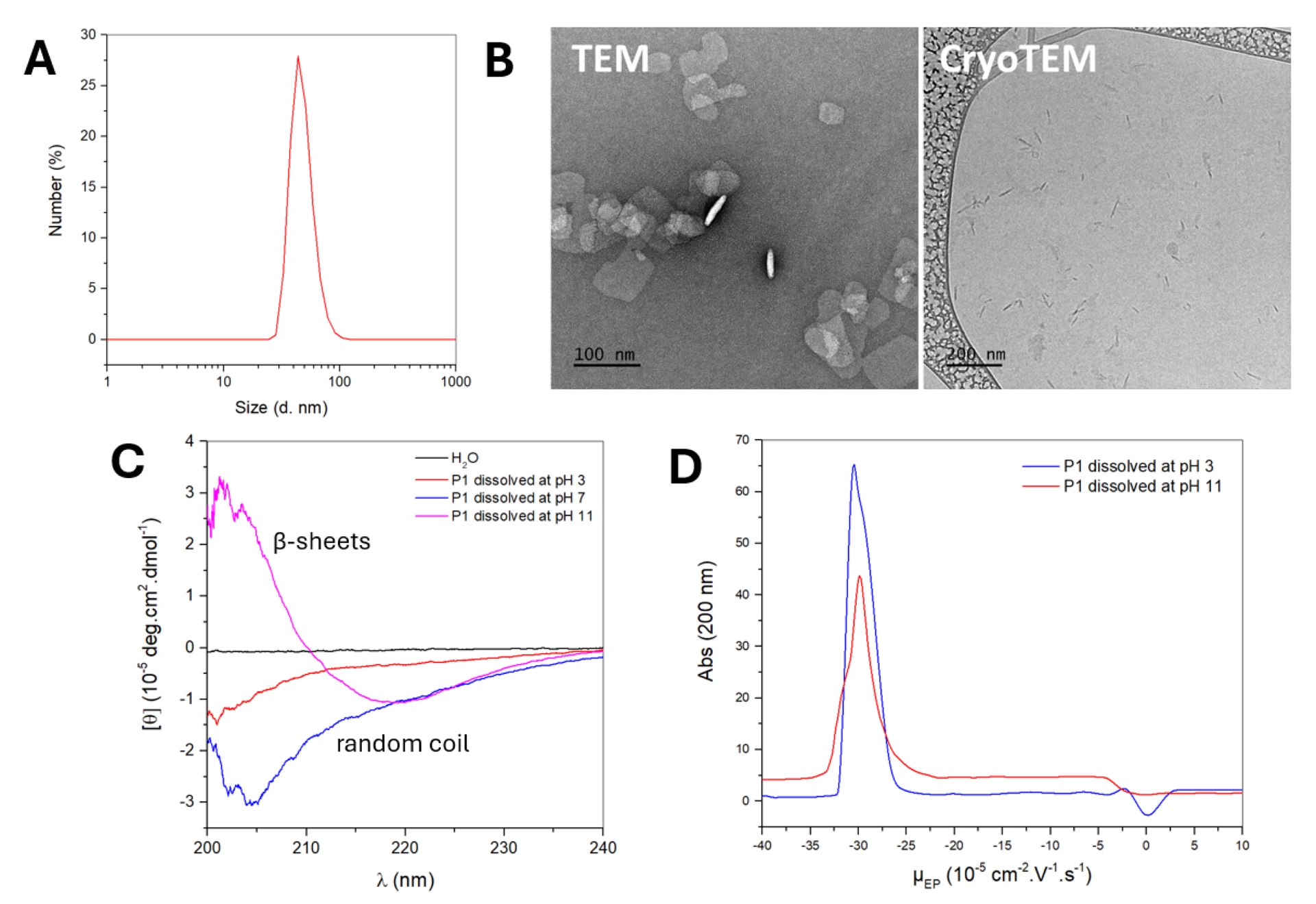 (A) Size distribution of self-assembled P1 (1 g⋅L−1) at pH 11 obtained by DLS, in percentage of number of particles. (B) TEM and cryo-TEM images of self-assembled P1 at pH 11. (C) Circular dichroism spectra of P1 dissolved at pH 3, pH 7 and pH 11. (D) CE-UV electropherograms of P1 dissolved at pH 3 (blue) and pH 11 (red), analyzed in 10 mM sodium phosphate buffer (pH 11). Adapted from Ref. [54].