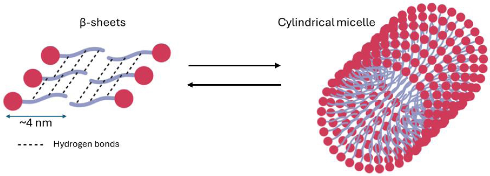 Proposed nanostructuring of P1 at pH ⩾ 11, as a cylindrical nanorod stabilized by inter-peptide hydrogen bonds between polyvalines. Adapted from Ref. [54].