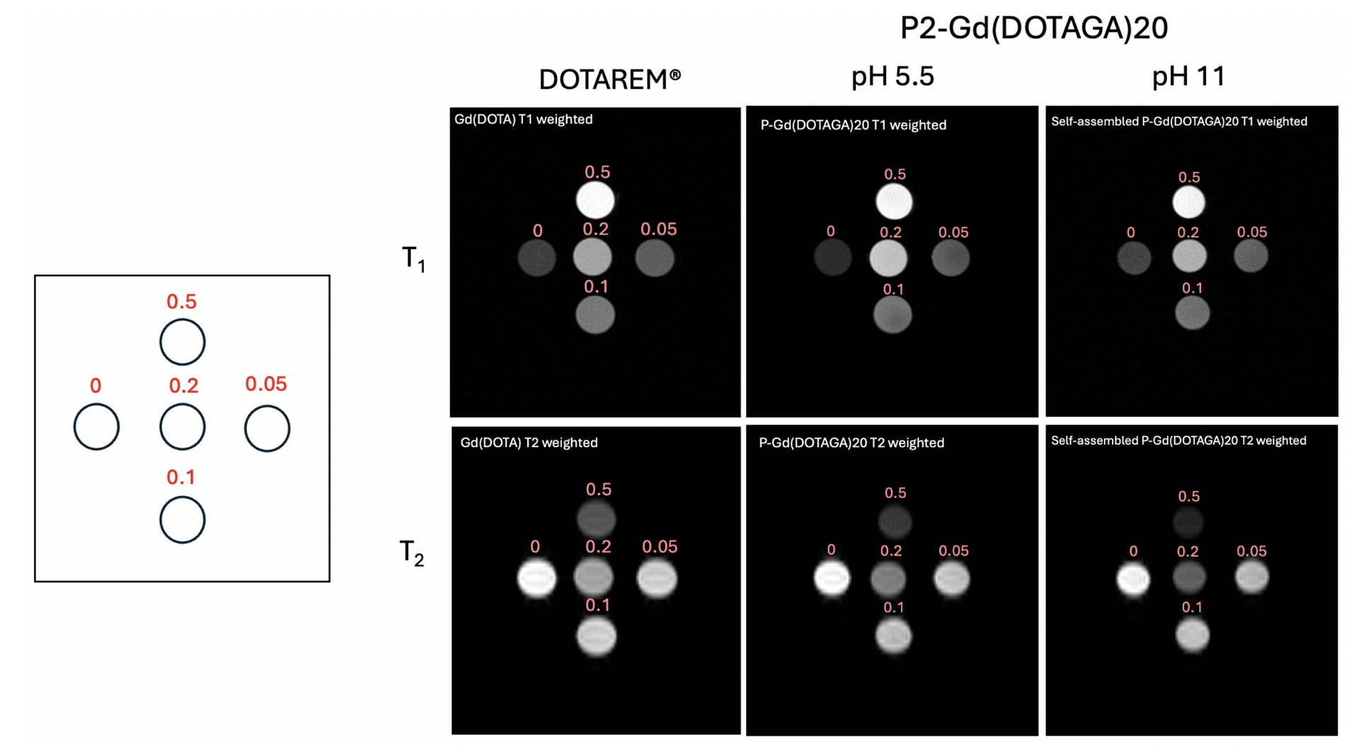 T1- and T2-weighted MRI images of Gd(DOTA) (DOTAREM®) and P2-Gd(DOTAGA)20 at pH 5.5 and pH 11, at 7 T, 293 K. Concentrations (red) are given in mM. Adapted from Ref. [47].
