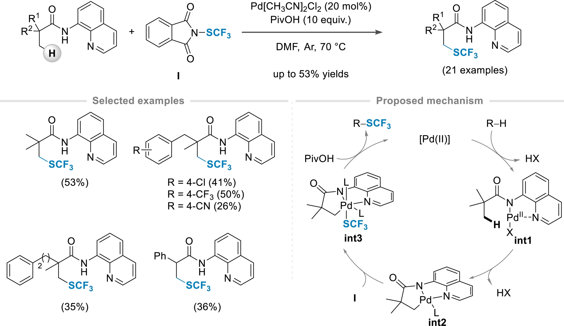 Benefiting from the recent breakthroughs made in homogeneous catalysis and especially how transition-metal-catalyzed C–H bond functionalization has revolutionized the way molecules can be made [1, 2, 3, 4, 5, 6, 7, 8, 9, 10, 11, 12, 13, 14, 15, 16, 17, 18, 19, 20, 21, 22], we first focused on the direct construction of C–S bonds by transition metal catalysis via C–H bond activation on aliphatic molecules. This task is challenging considering the inert character of non-acidic C(sp3)–H bonds. Merging our interest in homogeneous catalysis and organofluorine chemistry, special attention has been paid to the SCF3 moiety [24, 25, 26, 27], an emerging fluorinated group possessing high electron-withdrawing character and good ability to enhance molecule lipophilicity (Hansch hydrophobic parameter: π = 1.44 vs π = 0.88 for CF3) [28, 29]. Hence, Pd-catalyzed C(sp3)–H bond trifluoromethylthiolation of alkyl amides at the β-position, under mild conditions, was developed using electrophilic sources (Scheme 1) [30]. Optimization of the reaction conditions revealed that the presence of a bidentate directing group (amide derived from 8-aminoquinoline) and pivalic acid as an additive was crucial to ensure the selectivity and efficiency of the process (note that a flow process has then been developed, further improving the efficiency of the reaction [31]). Various aliphatic amides having primary β-C(sp3)–H bonds were functionalized. From α,α-dialkyl substituted amides, the reaction was then applied to α,α-dimethylated hydrocinnamic acid derivatives. Even amides prepared from phenylacetic acid derivatives or bearing α-C–H bonds were smoothly converted into the corresponding fluorinated product, allowing the synthesis of the SCF3-containing analogues of bioactive molecules such as ibuprofen and naproxen. Note that a total control of the selectivity was observed: monofunctionalization at the β-position only, even in the presence of competitive sites (e.g., benzylic positions). For the Munavalli reagent I, playing both the roles of oxidant and SCF3 source, a plausible mechanism is depicted in Scheme 1. After the coordination of the palladium catalyst with the bidentate directing group (intermediate int1), the metallacycle int2 was formed (C–H bond activation event). The latter would undergo oxidative addition in the C–SCF3 bond leading to the putative Pd(IV) species int3, which after reductive elimination would yield the desired product and release the catalyst. Interestingly, the directing group can be easily cleaved under basic reaction conditions and the SCF3 moiety is converted into the corresponding SOCF3 group when treated with m-chloroperbenzoic acid (m-CPBA).