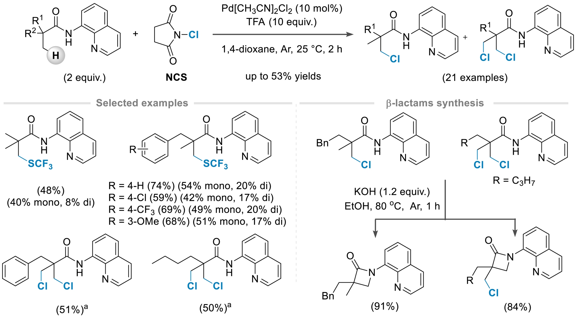 As the versatility of the above-depicted approach to functionalize C(sp3) centers was intriguing, the chlorination reaction was investigated. The Pd-catalyzed directed halogenation of non-activated C(sp3)–H is challenging as the reductive elimination is known to be difficult and the newly formed C–X bond might be reactive in the presence of the catalyst. Thanks to a Pd(II)/Pd(IV) process, known to facilitate the reductive elimination step, the Pd-catalyzed chlorination of aliphatic amides was developed using the readily available N-chlorosuccinimide (NCS) as the electrophilic Cl source (Scheme 2). The transformation proceeded smoothly at room temperature and favored the formation of mono- and di-chlorinated compounds, depending on the quantity of NCS. It is worth mentioning that when a mixture was obtained, the two compounds were easily separated by column chromatography. Thanks to this synthetic handle, the synthesis of β-lactams was realized by the treatment of chlorinated amides under basic conditions. This approach provided an access to molecules of interest for pharmaceutical and agrochemical companies. Moreover, under oxidative conditions in the presence of ceric ammonium nitrate, the amide derived from 8-aminoquinoline was smoothly converted into the corresponding primary amide.