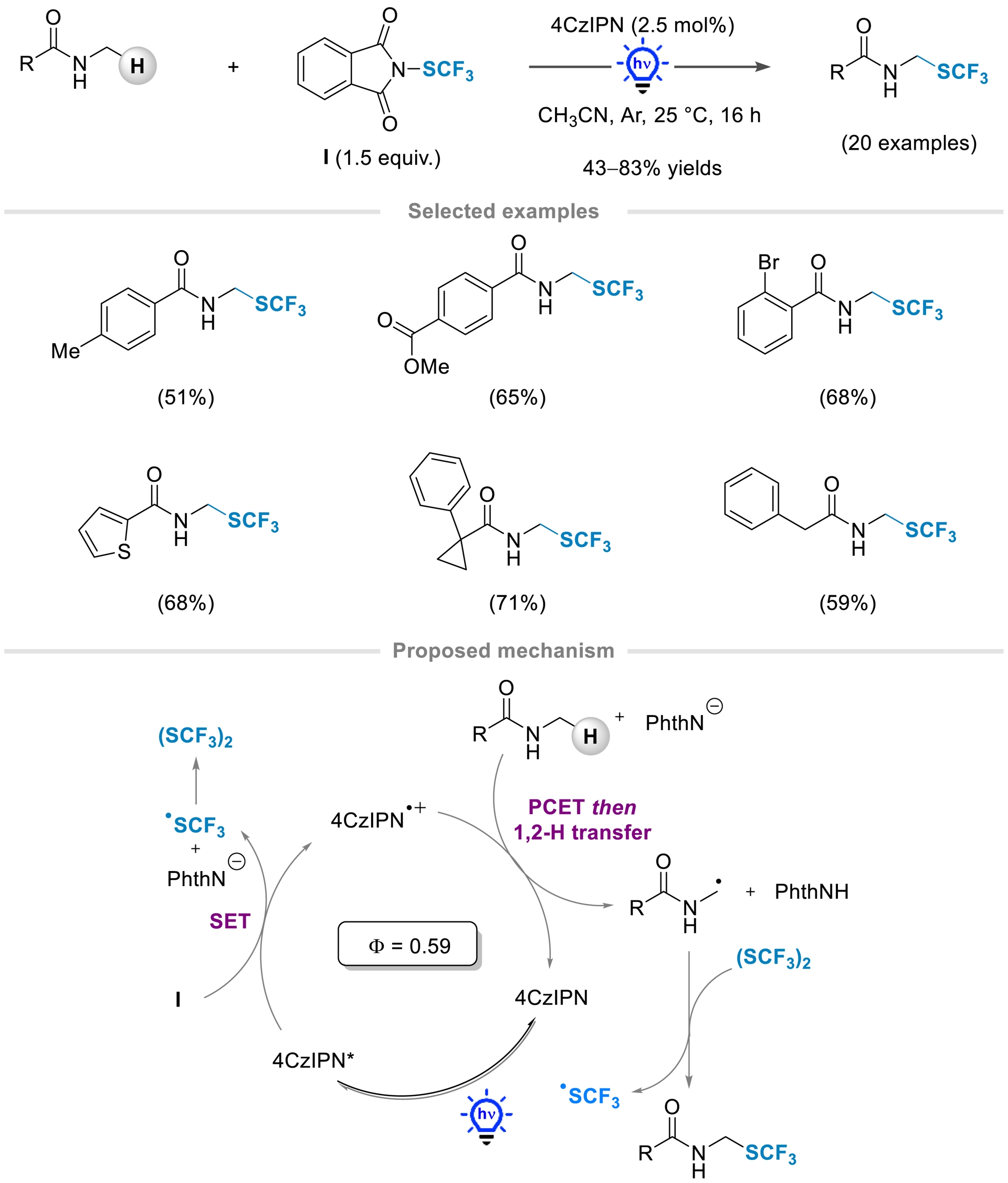 Detailed mechanistic studies were conducted. They revealed that the active SCF3 species was the in situ generated SCF3 dimer and supported a proton-coupled electron transfer (PCET). Indeed, the following plausible mechanism for this trifluoromethylthiolation reaction was suggested. The irradiation induces the excited state of the tetrakis(9H-carbazol-9-yl) isophthalonitrile (4CzIPN) photocatalyst, which reduces the electrophilic SCF3 source via a single electron transfer, leading to the generation of a SCF3 radical that can recombine to form the (SCF3)2 dimer along with the oxidized photocatalyst (4-CzIPN∙+). In the presence of the released phthalimide anion, a PCET followed by 1,2-hydrogen atom transfer (HAT) occurred, allowing the formation of a primary radical at the α-position of the nitrogen. The latter would react with the (SCF3)2 dimer to furnish the desired product along with the ∙SCF3 radical.