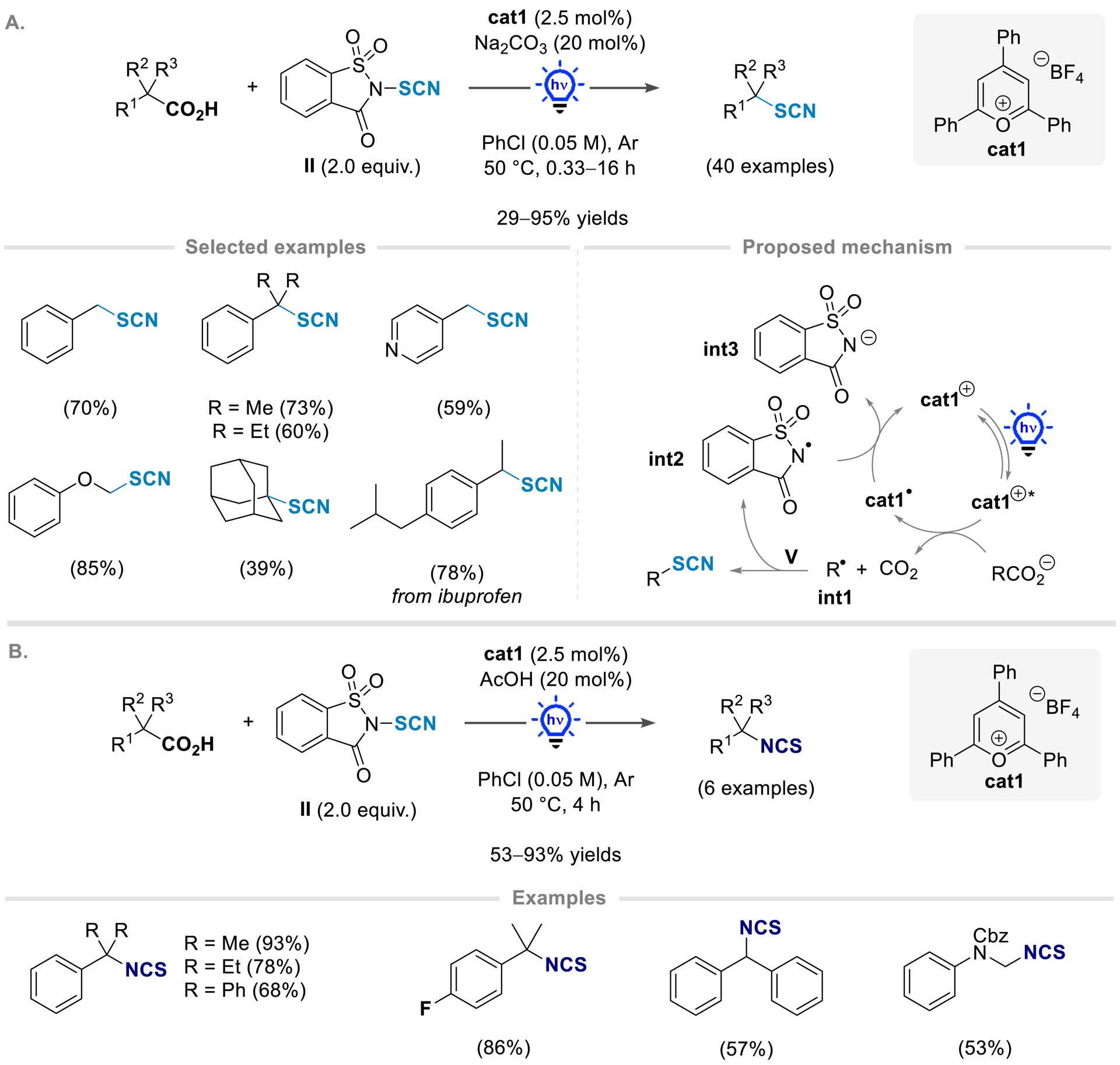 The mechanism of this transformation was proposed to involve a single-electron oxidation of the carboxylate formed by deprotonation of the corresponding carboxylic acid, leading to the radical intermediate int1 upon decarboxylation. Reaction with the thiocyanate source II then allowed the formation of the final thiocyanate product and the intermediate int2, which was subsequently reduced to int3, regenerating cat1. A radical chain propagation process involving HAT with int2 was also shown to be possible under the reaction conditions.