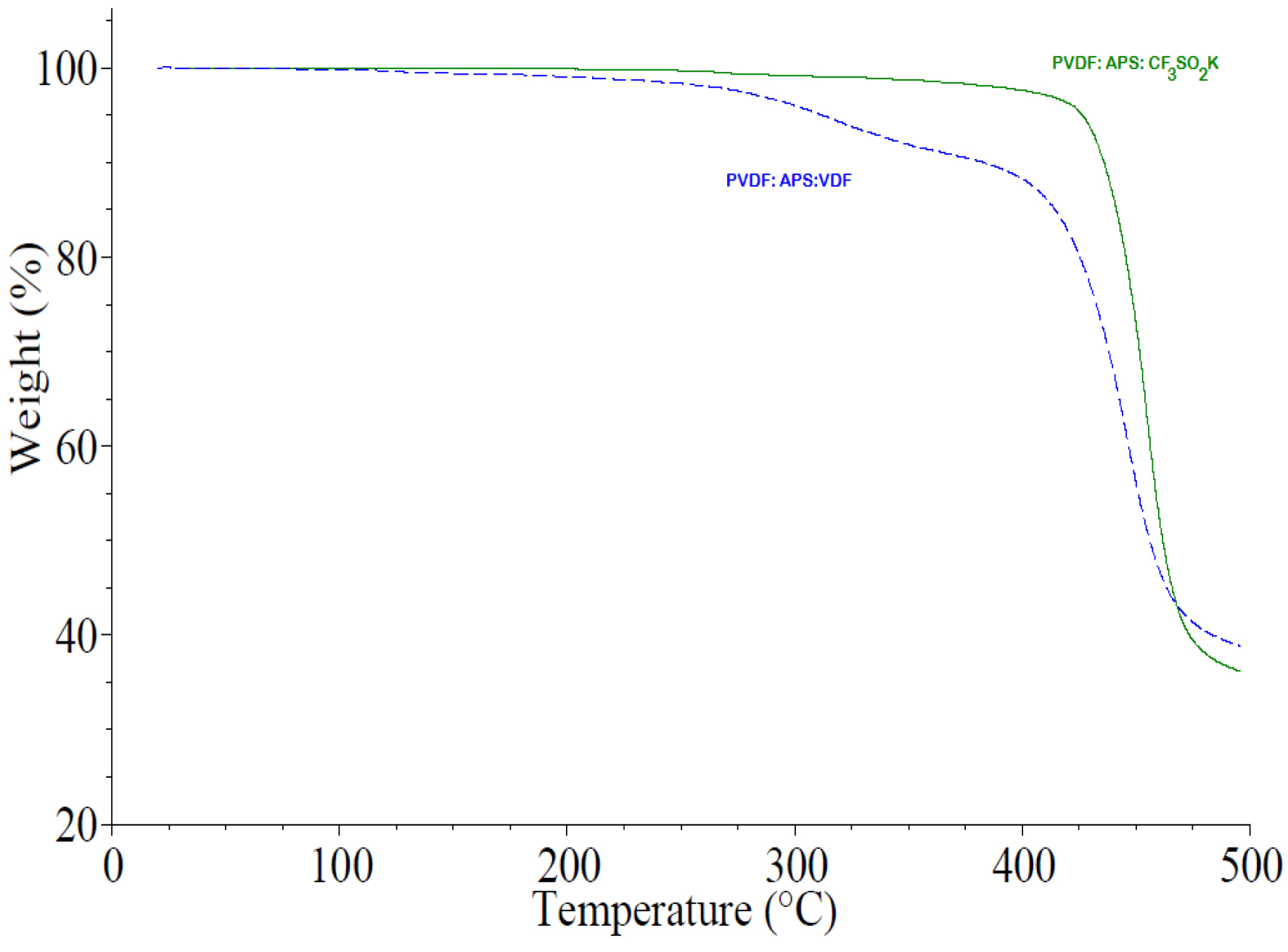 TGA thermograms of PVDF achieved in various initiations: ammonium persulfate (APS only, dotted line) and potassium trifluorosulfinate with CF3SO2K: APS (0.9: 1.0), full line) under nitrogen (reproduced with permission from Amer. Chem. Soc. [7]).