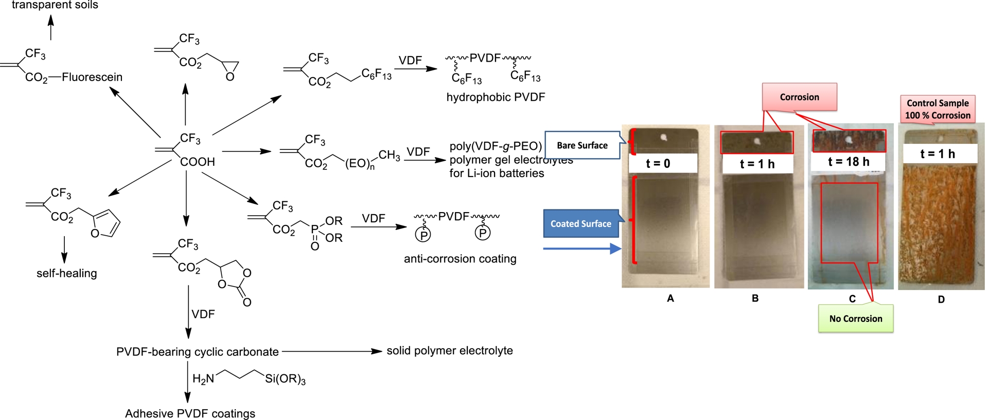 Overall strategies to synthesize novel functional 2-trifluoromethyl monomers from MAF and their radical copolymerization with VDF (left). Steel plates coated with poly(VDF-co-MAF Phosphonate) copolymer at the beginning of the experiment (A), after 1 h (B), and after 18 h (C). (D) Uncoated steel plate as reference sample after 1 h (right).