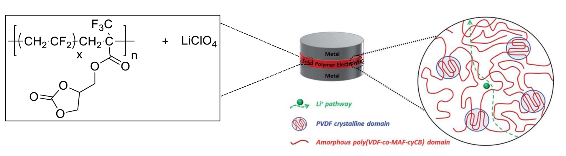 Single polymer electrolyte based on poly(VDF-co-MAF-cyCB) copolymers and LiClO4 salt for which the Li+ cation transport may occur via the amorphous state (reproduced with permission from RSC [24]).