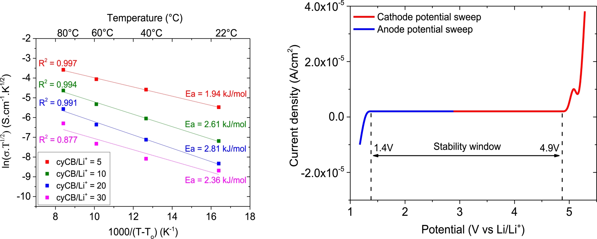 Temperature dependence of the ionic conductivity (left) and linear sweep voltammetry curves of polymer electrolyte with cyCB/Li+ = 5. The scan rate is 0.5 mV/s (right) for the investigated SPEs using VTF model (reproduced with permission from RSC [24]).