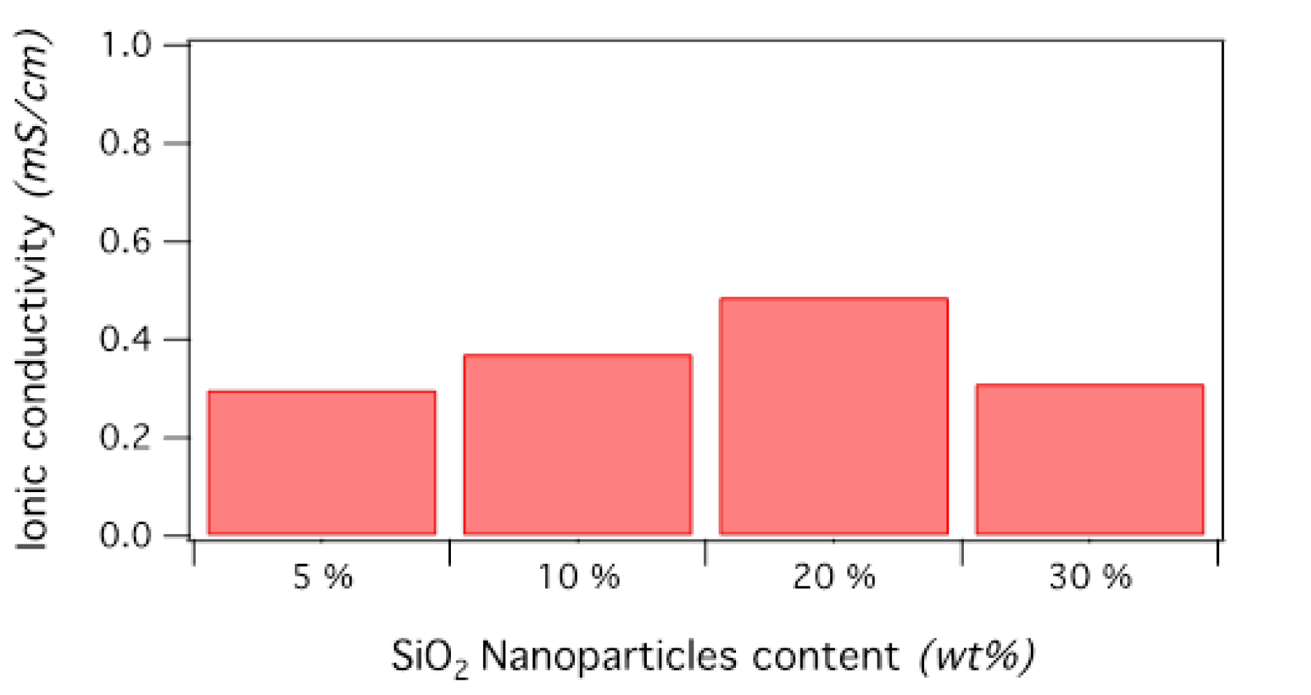 Ionic conductivities of PVDF-g-oligo(ethylene oxide) copolymers filled with Li salt and nanosilica (reproduced with permission from RSC [29]).