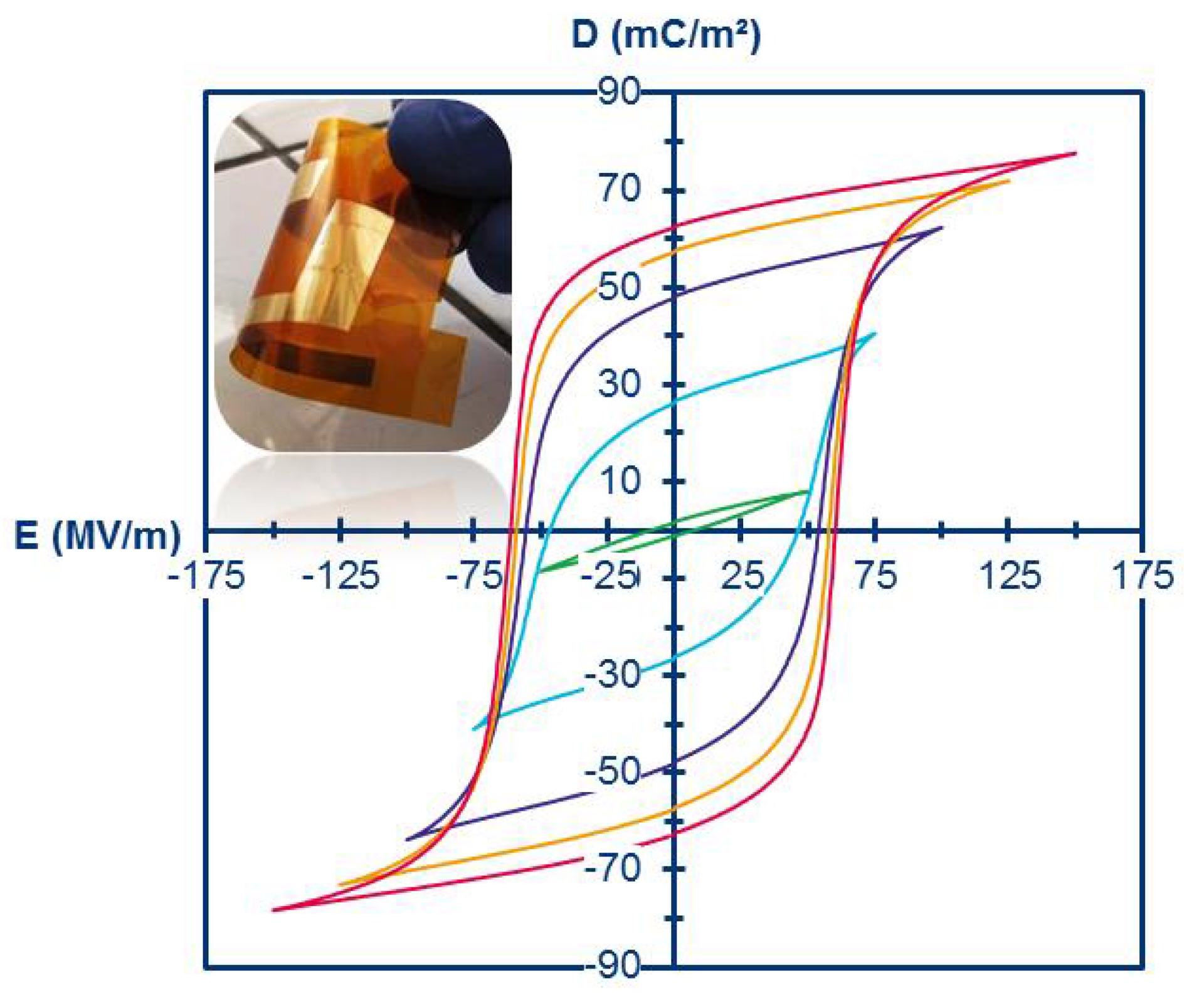 Continuous D–E loops of a poly(VDF69-ter-TrFE31-ter-MAF1) terpolymer (inset is a photograph of the flexible gold electrode coated with a 20 μm thick film) (reproduced with permission from RSC [43]).