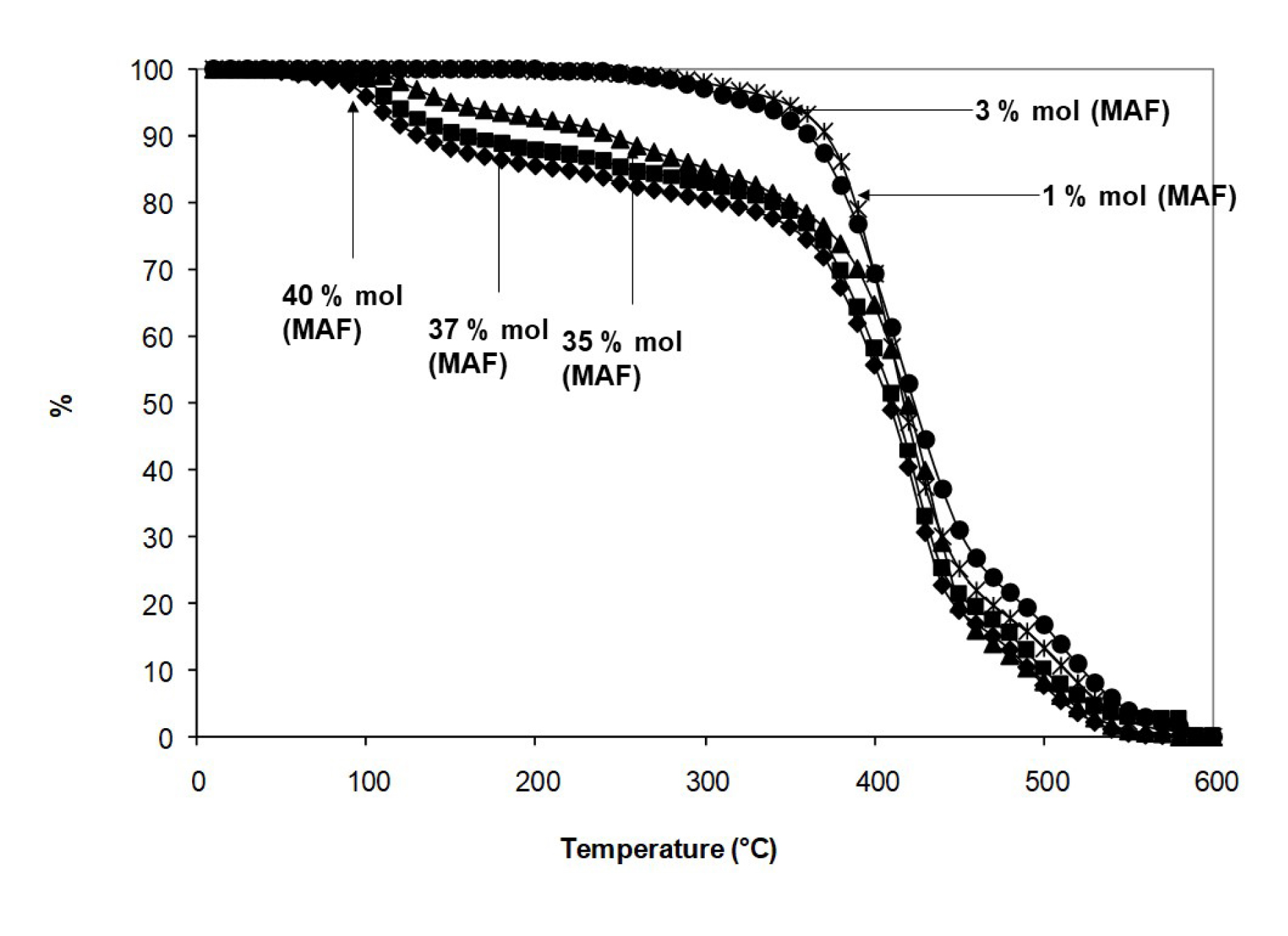 TGA thermograms of poly(VDF-co-MAF) at various MAF molar contents [25, 26].