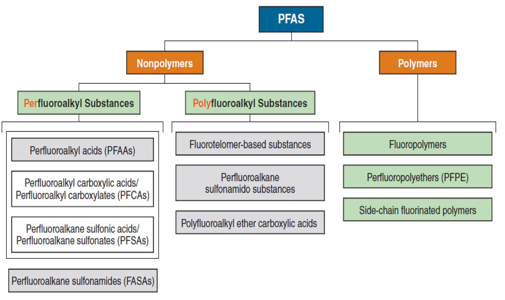 Distinguishing families of per- or poly-fluoroalkyl substances (PFAS) into two domains (reproduced with permission from MDPI [48]).