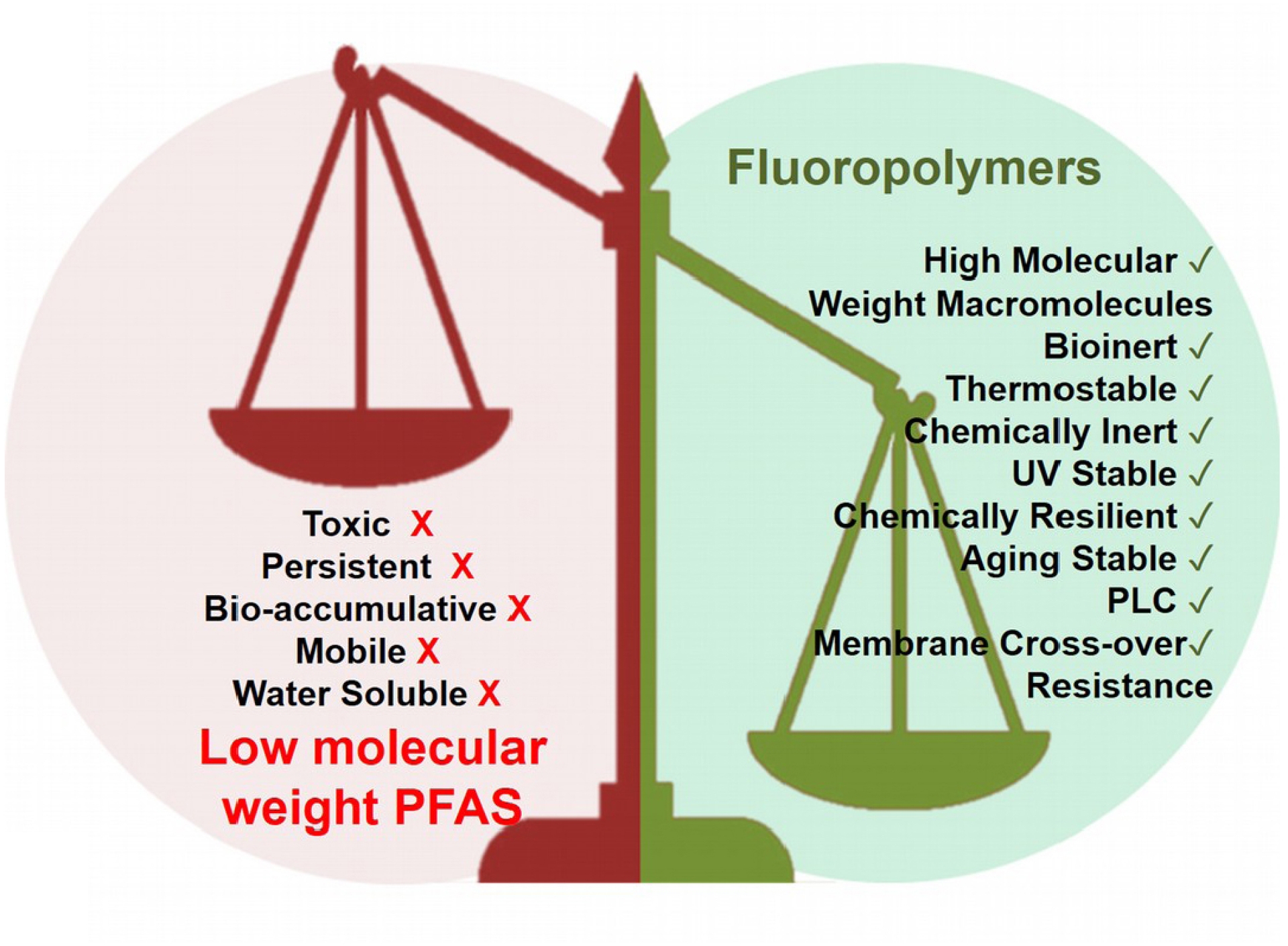 Except persistency (that can be also an advantage in resistance to aggressive media), these issues are not assigned to fluoropolymers (FPs) which are biocompatible and can be tolerated by human body [50, 51, 52]. In addition, FPs fulfill the 13 criteria of polymer of low concern (PLC), in terms of residual monomers, molar masses, dispersities, charges, etc. [53, 54] and really behave and contrast to low molar mass-compounds (Figure 11). However, 5 member states have pushed ECHA and the regulatory agencies to restrict them [55], though more than 5600 answers to the consultation were submitted [55].