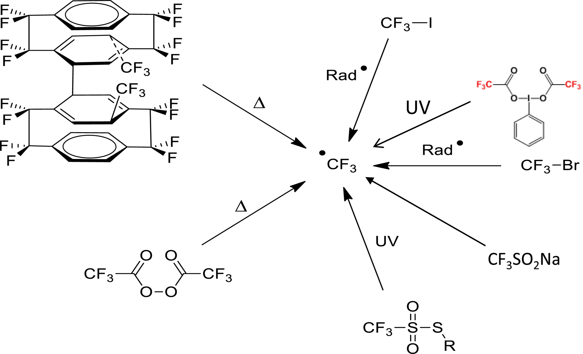 Non-exhaustive strategies to generate a trifluoromethyl radical.