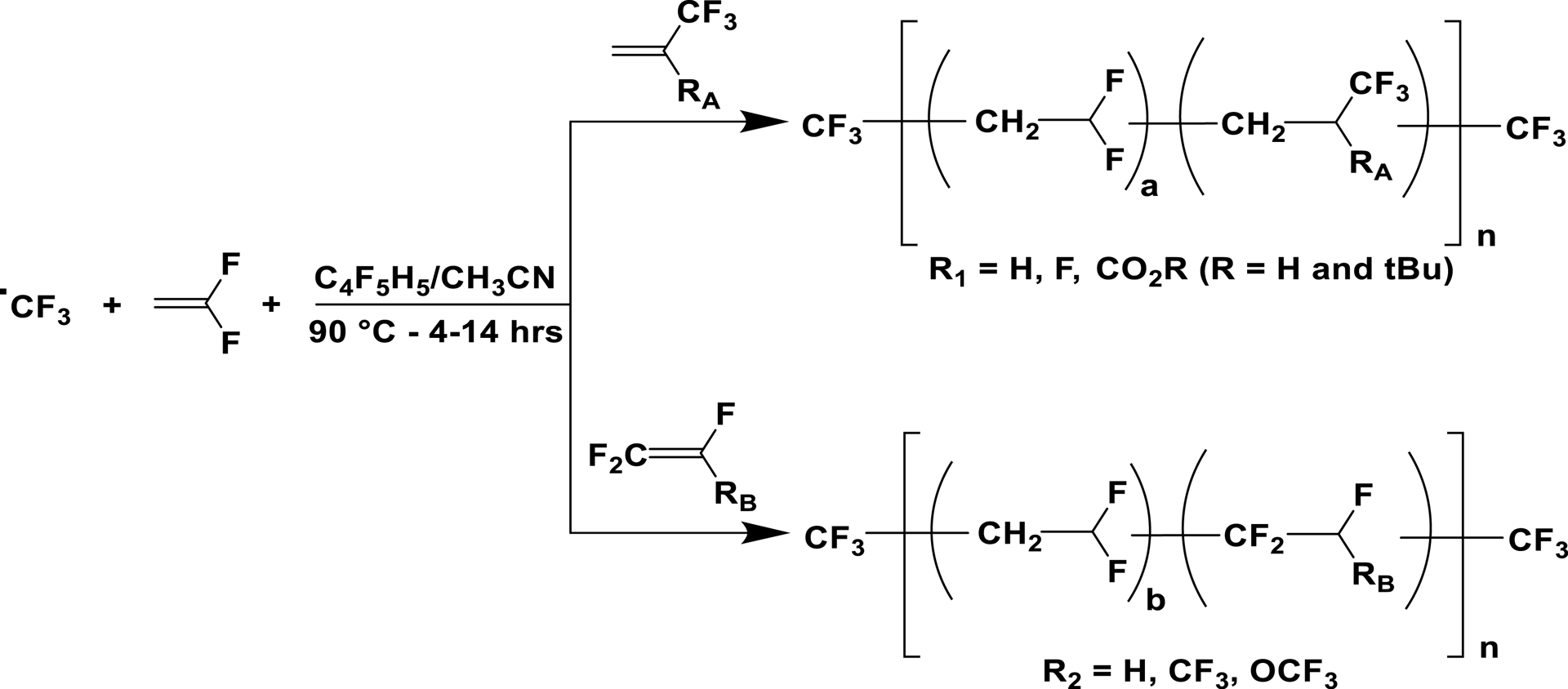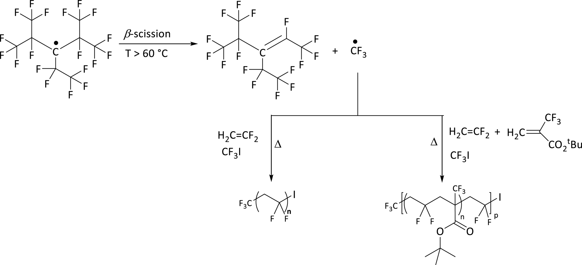 As displayed in Scheme 1, various fluorinated reactants can release trifluoromethyl radical, which can also be generated at T > 80 °C from perfluoro-3-ethyl-2,4-dimethyl-3-pentyl persistent radical (PPFR) at stable room temperature (Scheme 3) [10, 11], or from by using CF3I as a chain transfer agent involved either in telomerization [12] or in iodine transfer (co)polymerization of fluoroolefins [13]. This strategy was also extended to copolymerization of VDF with a wide range of fluoroolefins (Scheme 4) [14].