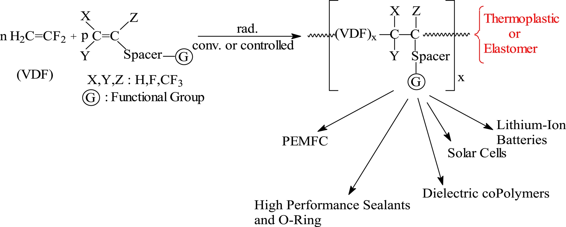 Fluoropolymers are niche macromolecules regarded as irreplaceable materials, endowed with exceptional chemical, thermal, electrical, optical, and UV resistance properties. Hence, they have found many applications in high-tech domains, such as aerospace, automotive, internet of things, optics and electronic industries [1, 2, 3, 4, 5, 6]. Many specific items such as high performance elastomers, stable cables in photonics (core and cladding in optical fibers), chemically resistant membranes for desalination or in ion exchange for fuel cells, gaskets, binders for batteries in lithium (or sodium) ion batteries, lubricants for wind mills, for O-rings and diaphragms, protective paints, coatings and backsheets for photovoltaic panels [1, 2, 3, 4, 5, 6]. The aims of this mini-review are: (i) elucidating efficient radicals can be used to initiate (co)polymerization of one of the most manufactured monomer, vinylidene fluoride (VDF), (ii) proposing a comonomer as an efficient VDF partner and (iii) presenting applications expected from the resulting copolymers.