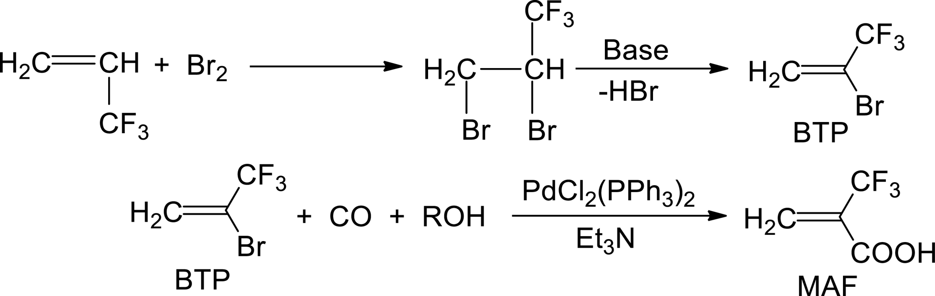 Synthesis of 2-trifluoromethacrylic acid (MAF) from bromination of 3,3,3-trifluoropropene and further steps [21].