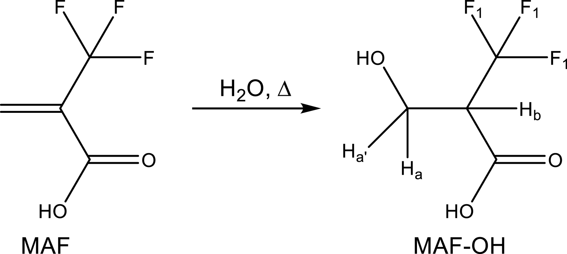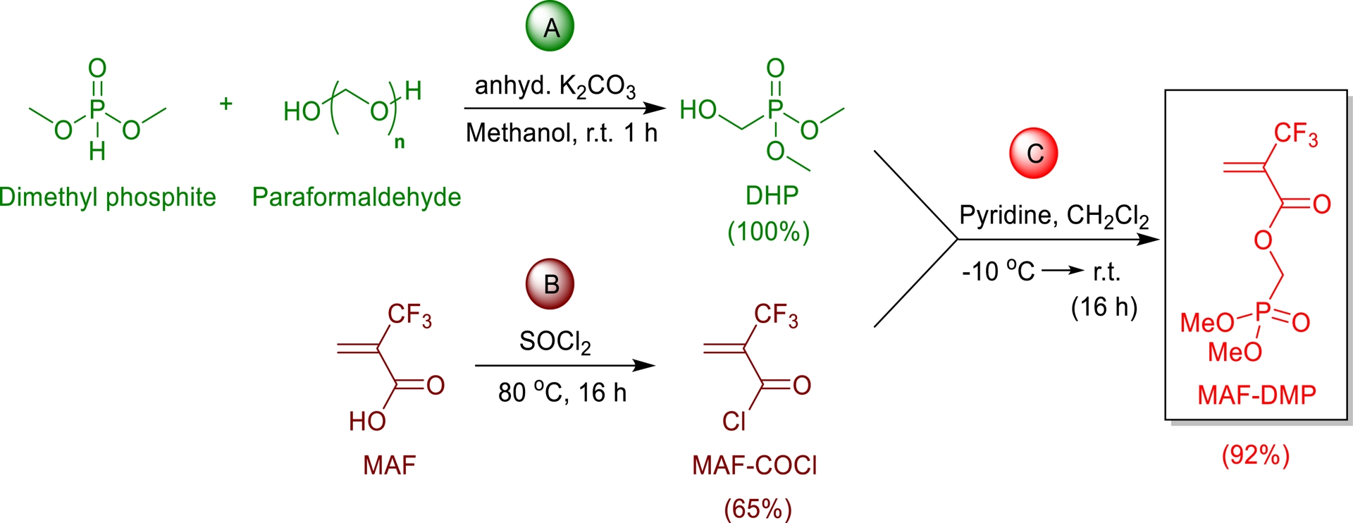 Synthesis of dimethyl phosphonate 2-trifluoromethyl acrylate (MAF-DMP) by condensation of MAF acroyl chloride onto 2-hydroxy dimethyl phosphonate [30].