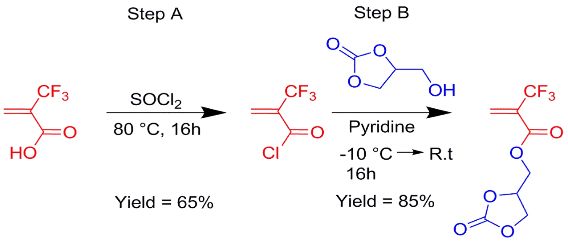 Synthesis of (2-oxo-1,3-dioxolan-4-yl)methyl 2-(trifluoromethyl)acrylate (MAF-cyCB) from the condensation of glycerol 1,2-carbonate with MAF-acryloyl chloride [31].