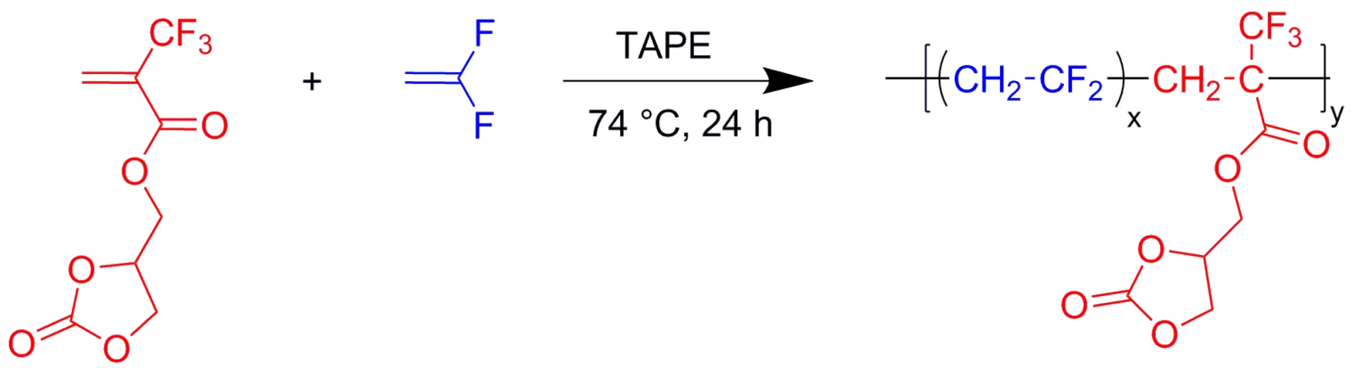 Radical copolymerization of VDF with (2-oxo-1,3-dioxolan-4-yl)methyl 2-(trifluoromethyl)acrylate (MAF-cyCB) initiated by tert-amyl peroxy-2-ethylhexanoate (TAPE) [24, 31].
