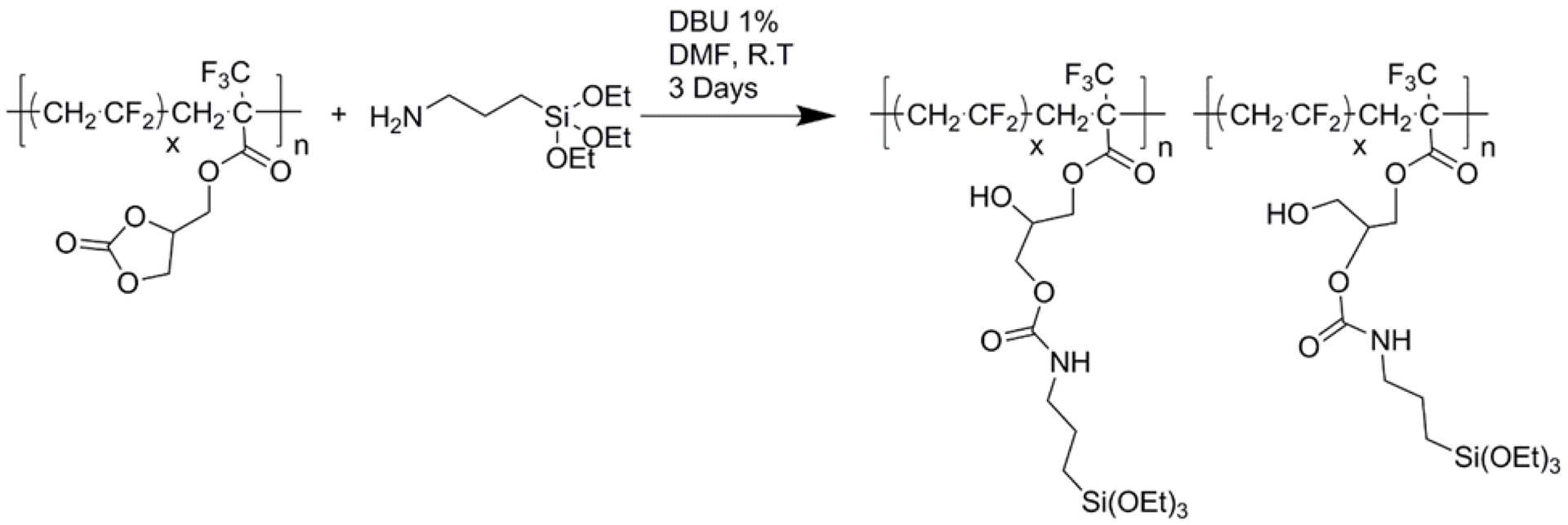 Chemical modification of poly(VDF-co-MAF-CyCB) copolymers by ring opening of cyclocarbonate with an aminopropyl triethoxysilane [31].