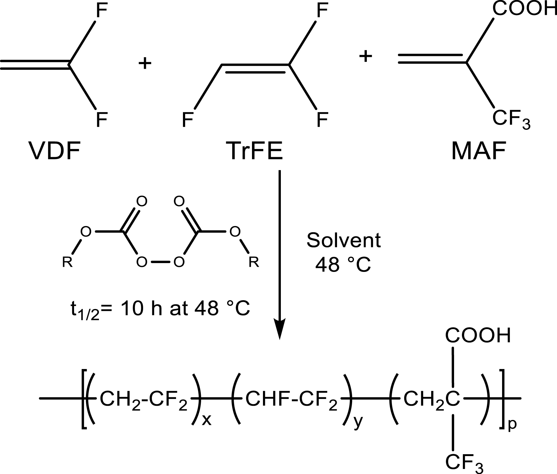 Conventional radical terpolymerization of VDF, trifluoroethylene (TrFE) and 2-trifluoromethacrylic acid (MAF) to obtain electroactive devices. In the peroxydicarbonate initiator, R stands for tert-butyl(cyclohexyl) [43].