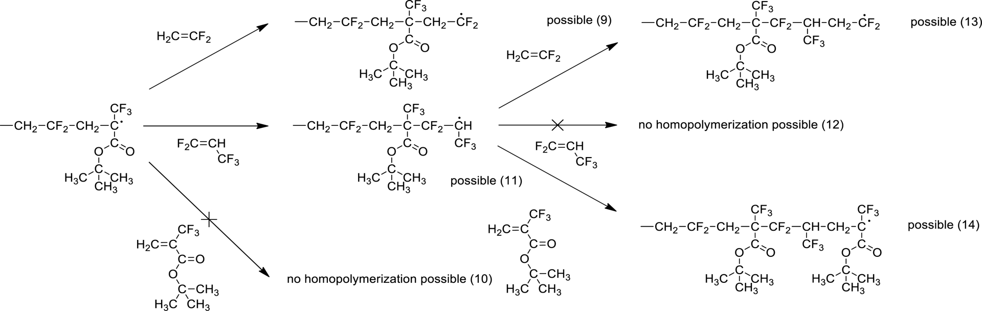 Among the first series, functional 2-trifluoromethacrylates (MAF-funcs) have been shown to be suitable partners to VDF [22, 23, 24, 25, 26, 27]. Interestingly, though this monomer cannot homopropagate under radical polymerization, tert-butyl 2-trifluoromethacrylate (MAF-TBE) is quite efficient in copolymerization with VDF leading to quasi-alternating copolymers, as displayed in Scheme 8 that mainly highlights crosspropagation steps. Their reactivity ratios were calculated to be: rVDF = 0.040 and rMAF‐TBE = 0.036 at 57 °C [27].