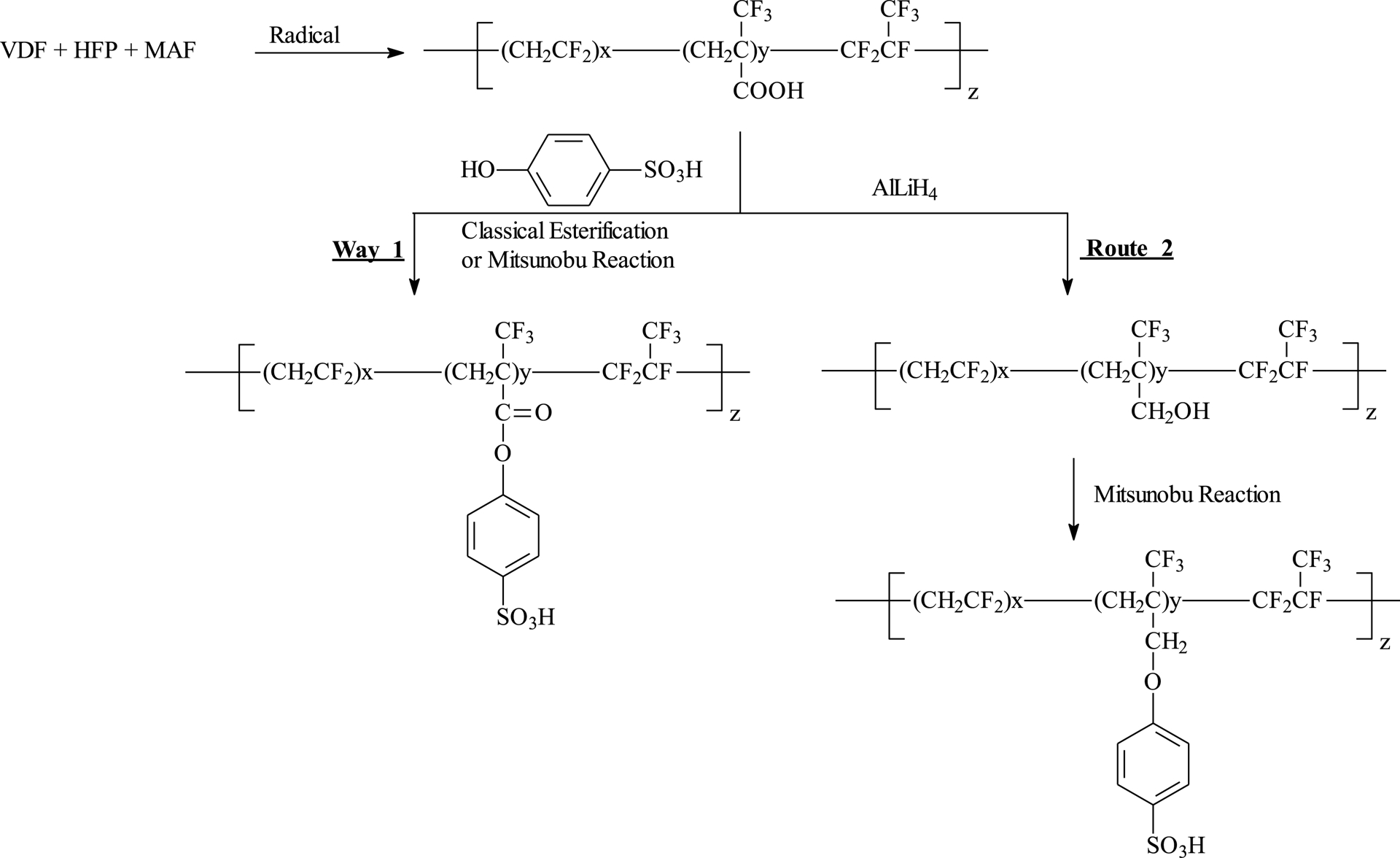 Thus, the reduction of such acid groups was reported, the resulting hydroxyl group undergoing a Mitsunobu reaction with para phenol sulfonic acid (route 2, Scheme 20), hence inserting strong acid as a possible example of fuel cell membranes [25, 26]. As expected, this etherification enhanced the thermal stability of the copolymer and could be straightforward compared to an esterification in medium yields (way 1, Scheme 20) and for which the ester link is poorly stable in acid media [25, 26].