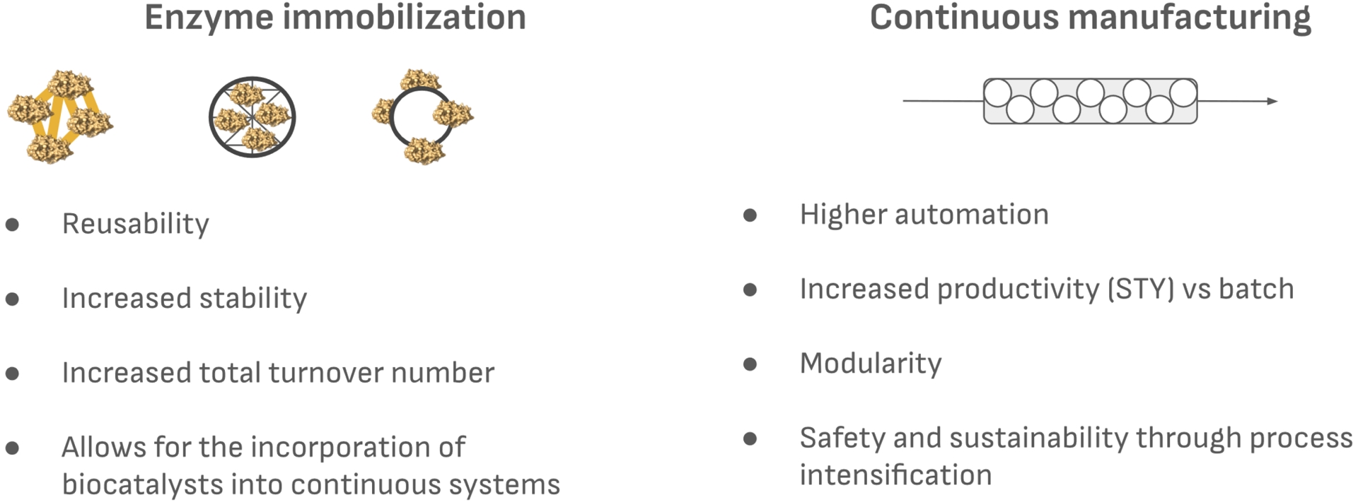 Main advantages of enzyme immobilization and continuous manufacturing.