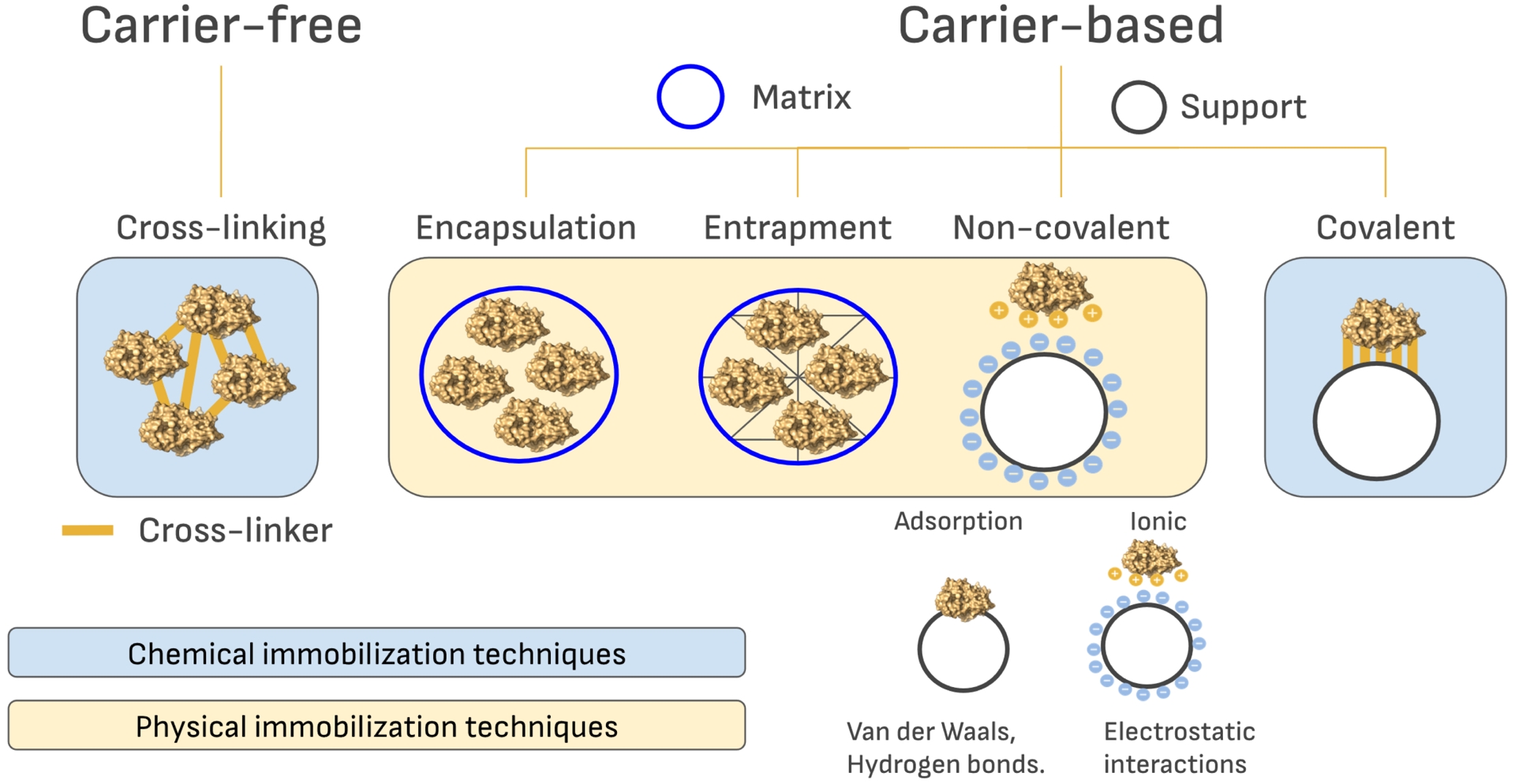 Immobilization methods are typically classified into reversible techniques (such as adsorption, encapsulation, and reversible covalent binding) and irreversible techniques (including cross-linking and irreversible covalent binding). However, for the purpose of this short overview, we classify immobilization methods based on the use (or not) of a solid support to immobilize the enzyme: carrier-based and carrier-free methods (Figure 2).