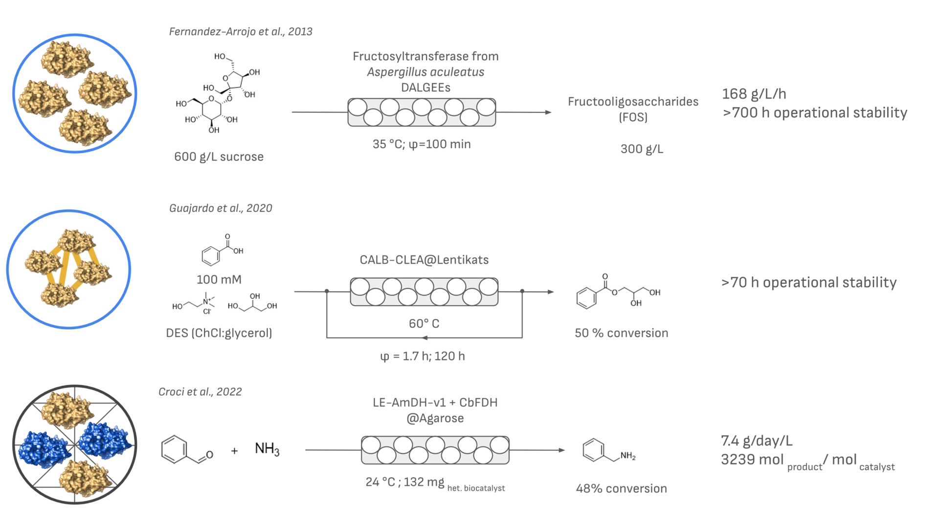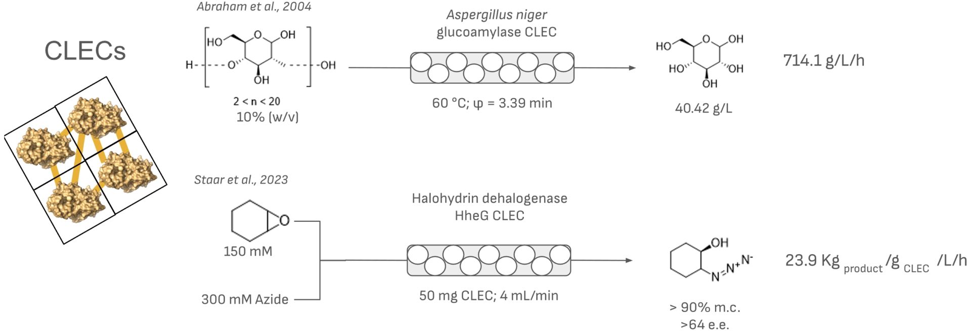There are different approaches to the creation of cross-linked (CL) biocatalysts. Enzymes can be cross-linked in different forms: as soluble enzymes (CLEs), lyophilized (CLELs), or in the form of enzyme aggregates (cross-linked enzyme aggregates [CLEAs]) and enzyme crystals (CLECs) [30]. Among these options, the most common strategies are CLEAs and CLECs, but only CLECs have been successfully incorporated into PBRs without further modification [31]. The application of CLEAs in flow biocatalysis has been challenging due to two main issues: the scalability in their production and their mechanical fragility [31, 32, 33]. Nonetheless, there are some examples such as the γ-lactamase CLEAs employed in a flow microreactor built from a capillary column [34, 35].