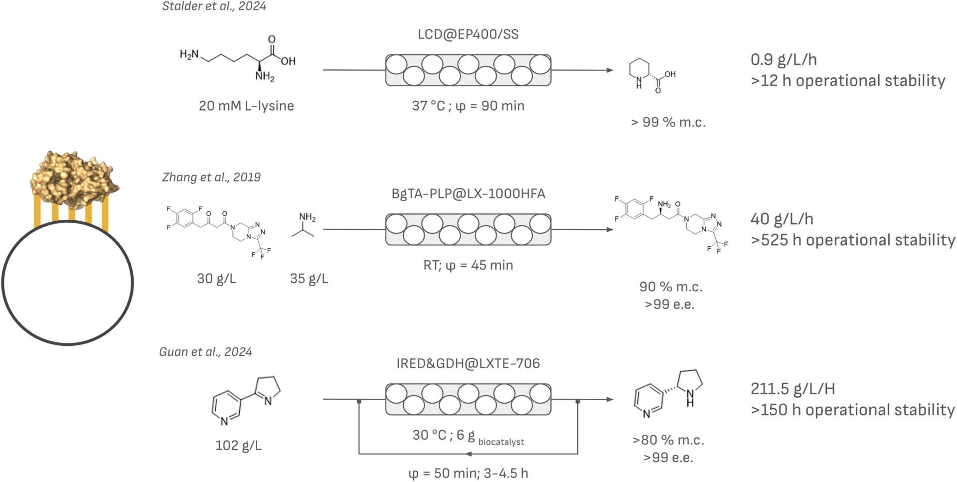 Several reviews have addressed the evolution of flow biocatalysis during the past 15 years [24, 25, 26, 27]. In this concise review, we have focused on the applications of distinct enzyme immobilization techniques in the form of PBRs. We discuss the different immobilization methods and highlight their applications in industrially relevant transformation in continuous flow, discussing their advantages and the challenges encountered. By understanding these developments, we aim to highlight the potential for future innovations that can further integrate enzymatic processes into continuous manufacturing for industrial chemistry.
