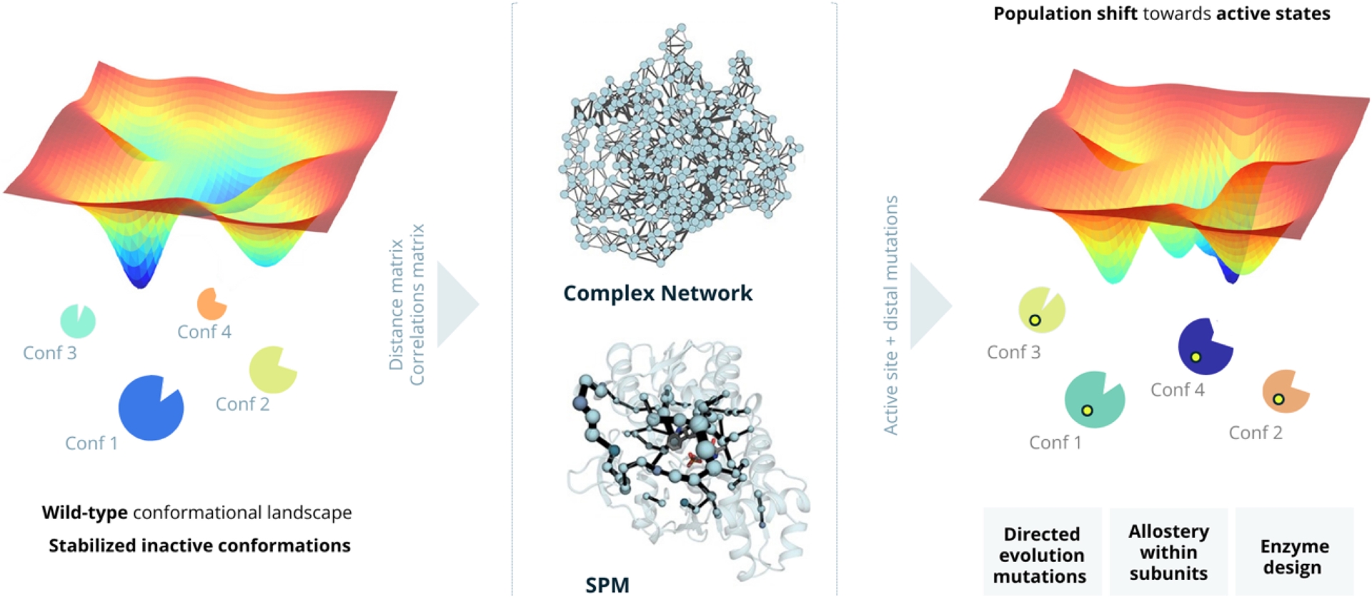 Computational enzyme design based on inducing a population shift on the enzyme conformational landscape towards active states by using the SPM method. Left: The wild-type enzyme conformational landscape features multiple stable states, which are predominantly catalytically inactive (labeled Conf 1, Conf 2, Conf 3, and Conf 4). This represents the enzyme conformational heterogeneity, but the enzyme presents poor catalytic efficiency as active states are poorly populated. Center: By computing the distance and the correlation matrices from the multiple replica MD simulations, the first complex graph network is generated, which is further simplified to obtain the SPM network. SPM identifies potential mutational hotspots that can influence the global conformational landscape and induce a shift in the population distribution towards catalytically active states. Right: By introducing targeted mutations at both active and distal sites, the conformational landscape is reshaped to favor catalytically active states. This approach has a wide range of applications, including directed evolution mutation identification (Section 2.1), elucidation and optimization of allosteric pathways (Section 2.2), and finally, rational enzyme design (Section 2.3).