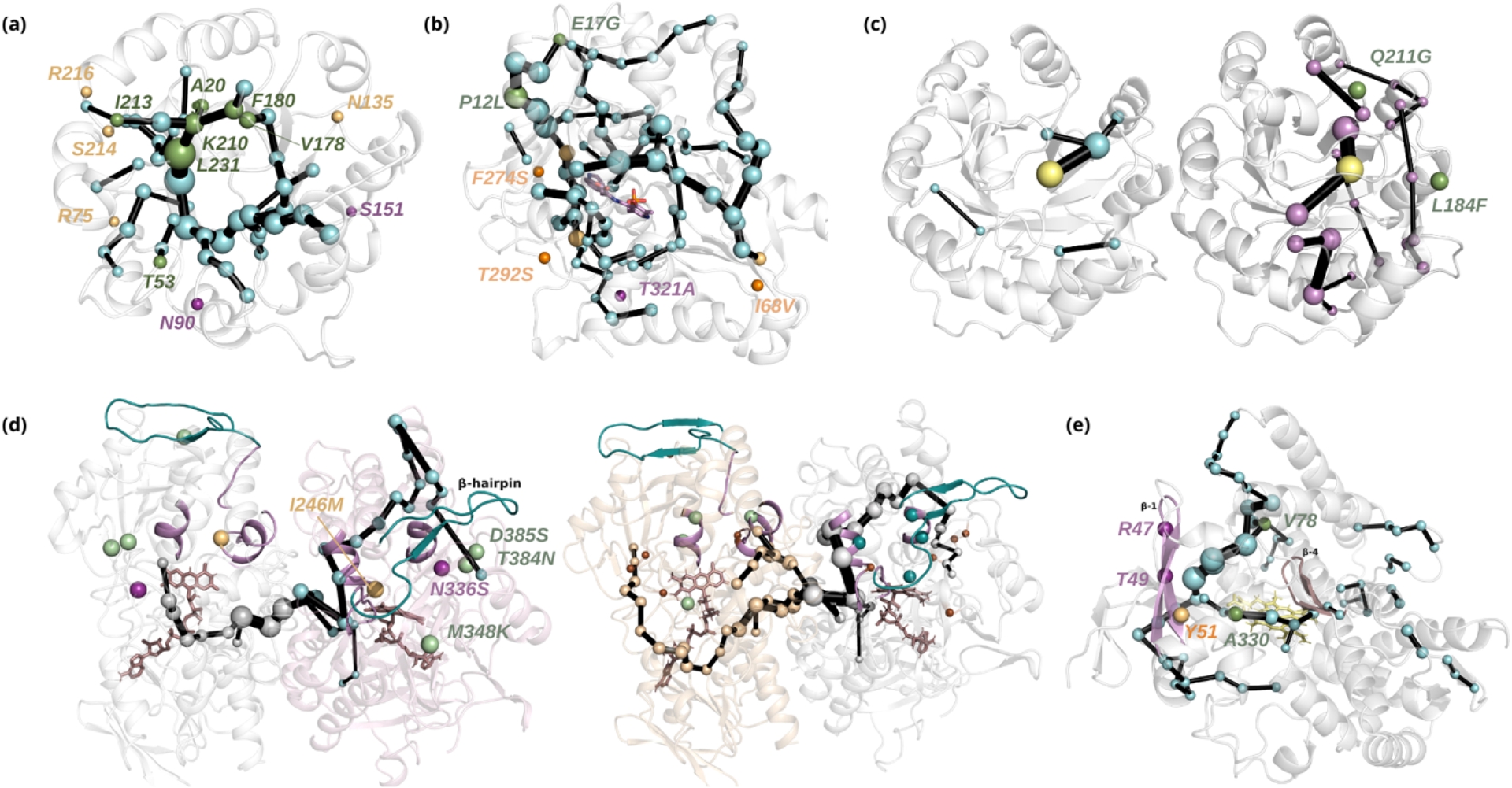 Some examples of the application of the SPM method for capturing DE mutations. (a) SPM is applied to retro-aldolase enzyme. Of the thirteen mutations introduced by DE, seven were directly identified by SPM (green) with an additional four located at adjacent positions (yellow). Only two mutations (purple) were positioned more than six residues away in sequence. (b) Six distal mutations in PfTrpB were introduced by DE to generate a stand-alone PfTrpB-0B2 variant. Of these, five mutations were identified by SPM: two directly captured by SPM (green) and three adjacent to SPM-identified positions (orange). The only distal mutation not captured by SPM is shown in purple. (c) The SPM in 1A53-2 (left) and 1A53-2.5 (right) depicts the interaction network centered on the transition state and extending to the closed state of the protein. The two mutations found by DE are directly involved in the SPM. (d) Right: The five mutations in MAON-WT identified by DE to generate MAON-D5 evolved variant are shown as spheres. The key DE mutations include one active site mutation (purple), one mutation at the entrance tunnel (yellow), and three additional distant mutations (green). Left: The DE mutations on MAON-D5 towards MAON-D9 variant are also captured by SPM and are shown in dark green while previous mutations are shown in brown. The beta-hairpin structure is highlighted in teal, and the entrance loop is represented in violet in both images. The FAD cofactors are depicted as sticks in dark violet. (e) The SPM pathway of the CYP450 enzyme included the previously identified DE mutations V78 and A330 (green). SPM also depicts the long-distance connection between beta-sheet 1 (purple) and beta-sheet 4 (light violet). The key mutation Y51I, identified by SPM as an adjacent position, is shown in yellow.