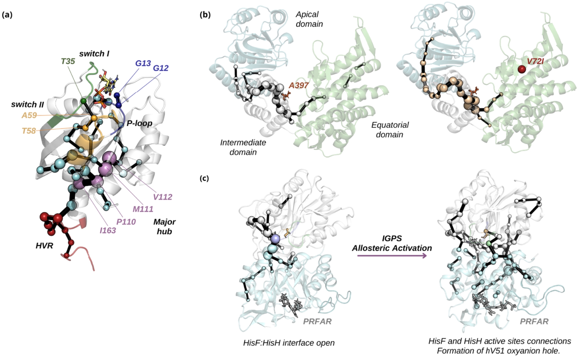 Allosteric regulation is a fundamental process in which distant residues within a protein communicate to regulate its activity. This long-range communication allows proteins to respond to various signals, adjusting their function accordingly. Understanding the specific pathways through which allosteric signals travel is crucial to enzyme design and for understanding how mutations alter protein function. The SPM has proven effective in mapping allosteric pathways in key proteins, offering insights into how mutations can alter their regulation and function. For instance, the SPM was applied to 5 μs atomistic MD simulations of the K-Ras4B protein embedded in a phospholipid membrane to investigate its allosteric regulation [64]. Allosteric regulation in K-Ras, particularly the oncogenic K-Ras4B, is key to its function in cellular signaling. K-Ras switches between an active GTP-bound state and an inactive GDP-bound state with allosteric changes in key regions of the G domain (switches I and II), enabling effector recruitment and signal transduction. Mutations, especially in Gly12 and Gly13, can disrupt this regulation, locking K-Ras in an active state and driving cancer progression [64]. The SPM identified a prominent allosteric pathway starting at the hypervariable region (HVR), a near-membrane region that might be receiving allosteric messages and transferring them to the major hub, located on helix α5, loop α3–β5, and the N-terminus of sheet β5 (Figure 3a). Branching out to key areas in the G domain, the allosteric route extends to regions crucial to K-Ras function, including the P-loop, Thr58, and Ala59 on switch II and Thr35 on switch I. The analysis of the allosteric communication existing in K-Ras4B was also assessed by means of other measures: distance fluctuation analysis [65, 66], anisotropic thermal diffusion [67], and dynamical non-equilibrium simulations [68], which provided complementary information on how allostery is transmitted when hydrolyzing GTP [64]. The SPM therefore provided useful insights into K-Ras allostery that help in identifying potential allosteric sites for therapeutic targeting, advancing drug design efforts for this protein.
