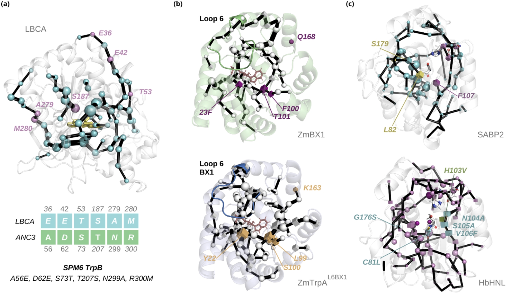 In another recent study also focused on a tryptophan synthase, the SPM tool was employed to enhance the stand-alone activity of Zea mays TrpA (ZmTrpA) by identifying key conformationally relevant positions [79] (Figure 4b). Unlike TrpB, where a shift in allosteric regulation was observed along its phylogenetic tree, LBCA TrpA was already allosterically activated by TrpB [77, 78]. This made more difficult the identification of positions for stand-alone activity using traditional methods like MSA. However, the structurally similar stand-alone enzyme ZmBX1 [80] from the secondary metabolism of maize served as a model for designing an enhanced TrpA variant [79].