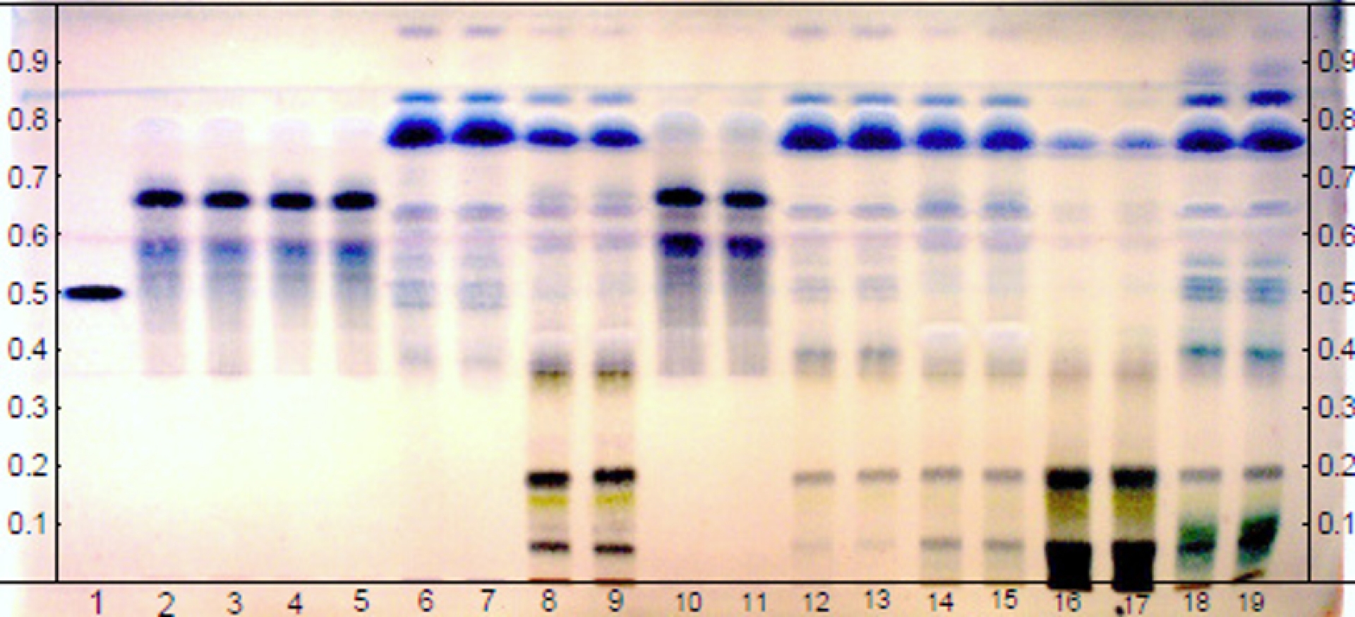 Result of the analysis of the chemical profile, via HPTLC, of the extracts obtained cold and hot, with the solvents Hex, AcOEt and EtOH (each in duplicate, see Table 1) and the limonoid standard 7-desacetoxy-7-oxogedunin (track 1). Elution system, gradient mode: Hexane/AcOEt/MeOH (1% HCOOH). VSA derivatizer.