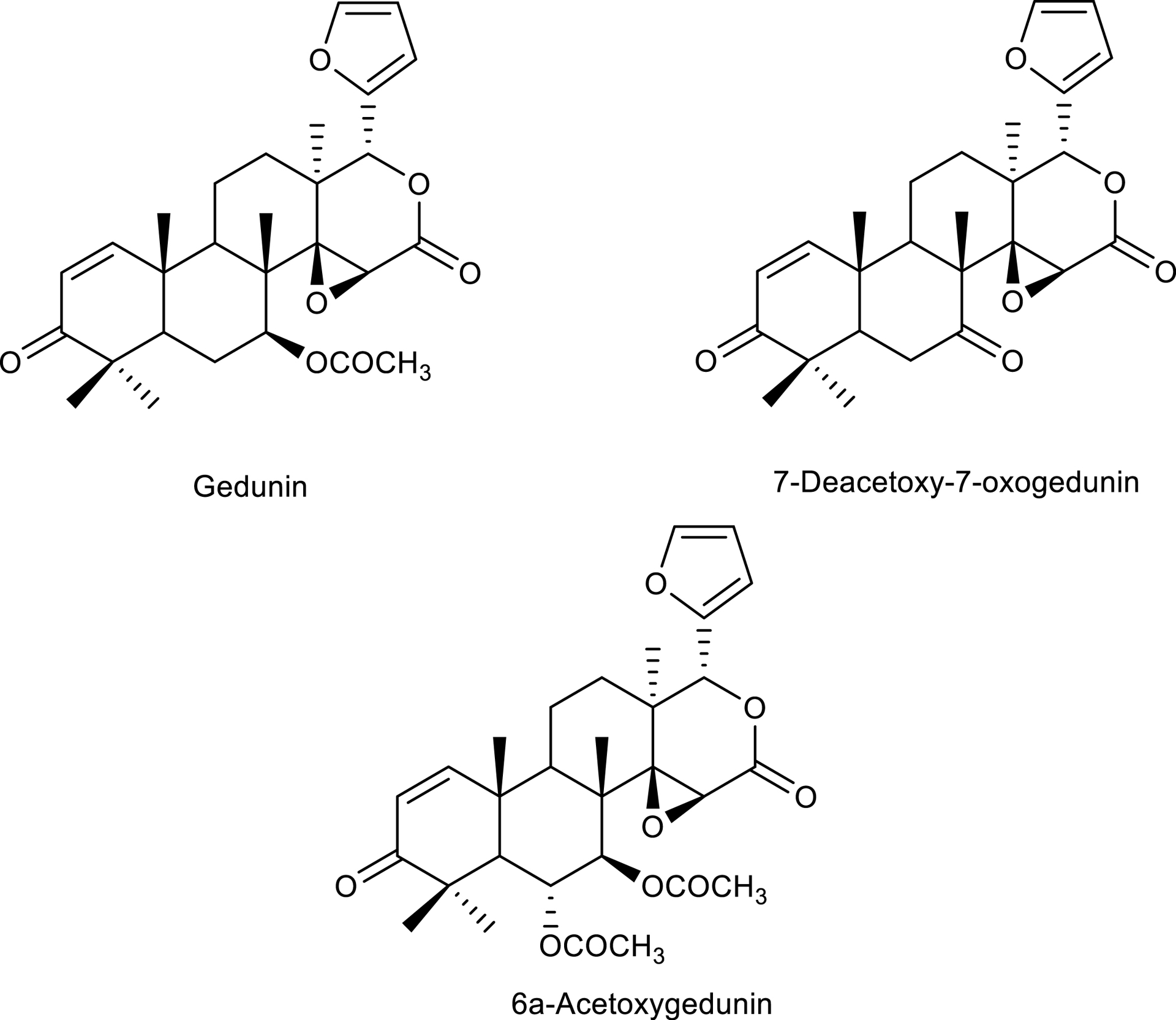 Gedunin (S1): From F1, fractions 56 to 72, a white amorphous solid (15 mg); 1H NMR (CDCl3) and 13C NMR (CDCl3) (see Tables 2 and 3; Section S1, Supplementary Material).
